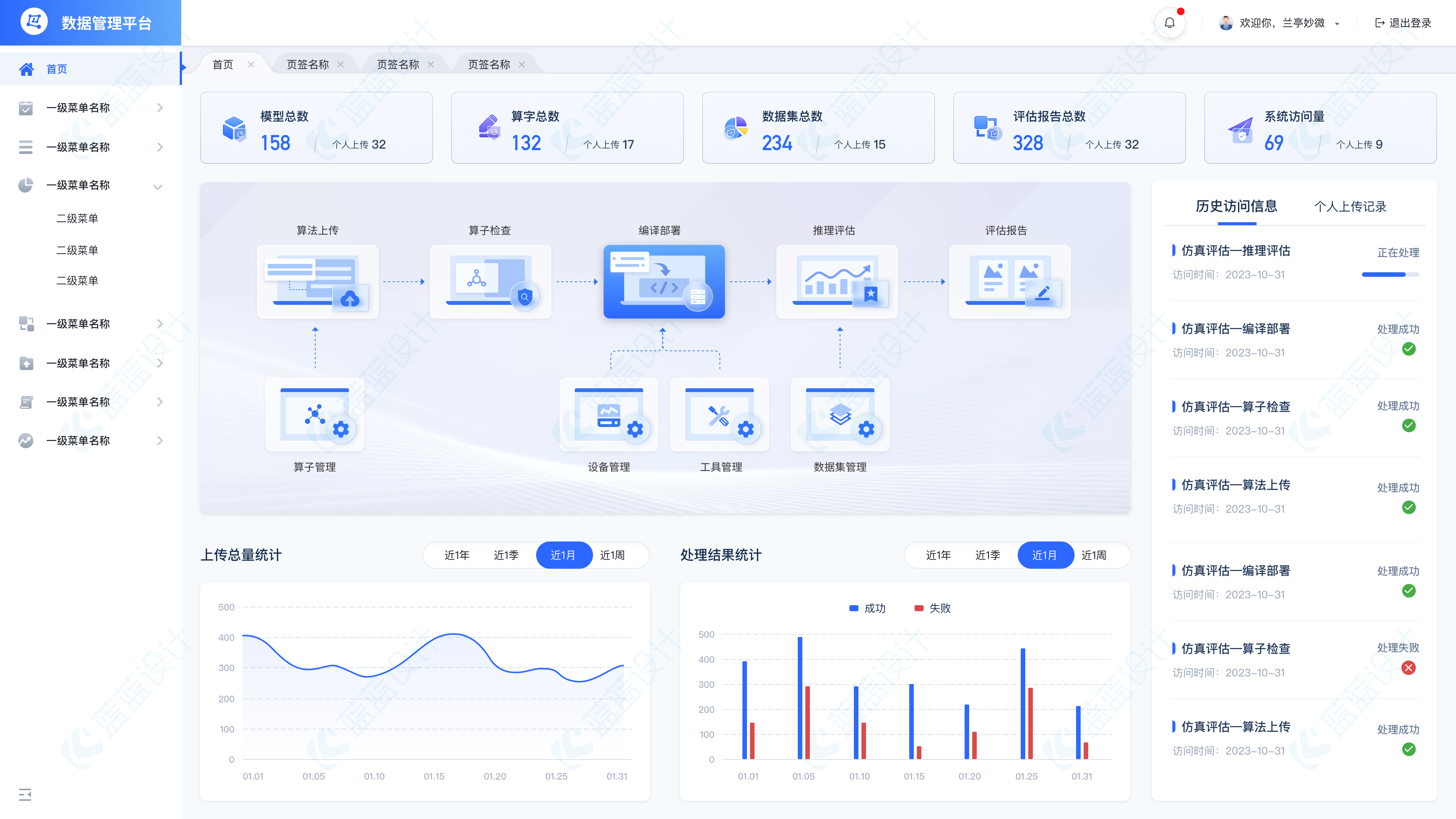 該系統(tǒng)的原首頁中信息量比較少,在設(shè)計(jì)時(shí)除了對(duì)頁面美觀的優(yōu)化,從內(nèi)容、布局、用戶使用場(chǎng)景、使用習(xí)慣、交互方式等方 面也進(jìn)行考慮,增加了一些統(tǒng)計(jì)的圖表, 「歷史訪問信息」采用卡片式列表,突出模塊和內(nèi)容。同時(shí)增加「?jìng)€(gè)人上傳記錄」信息和「歷史訪問信息」可以進(jìn)行 切換查看。