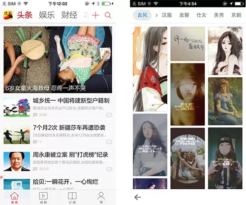 下面的左圖是一個(gè)新聞app,采用豎向分欄的布局,模塊化的結(jié)構(gòu)使得信息的展現(xiàn)整潔和嚴(yán)謹(jǐn)。右圖是一個(gè)圖片展示app,則采用了三欄的布局,把圖片以這種瀑布流的形式展現(xiàn)給用戶,方便用戶快速瀏覽。但是由于平級的信息,很難區(qū)分主次,而人的視線很難在同一時(shí)間聚焦在兩個(gè)或者兩個(gè)以上的事物上,所以通過圖片錯(cuò)路排列,使得畫面更為活潑。