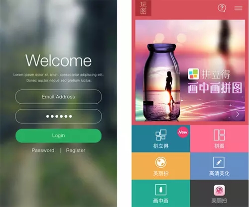 下面的左圖是一個(gè)注冊頁面,btn采用了中軸型的構(gòu)圖,清晰地展現(xiàn)了操作項(xiàng)和注冊流程。右圖采用了上下分割的版面構(gòu)成,上面為圖片展示,下面部分為選項(xiàng)和操作,結(jié)構(gòu)非常清晰。