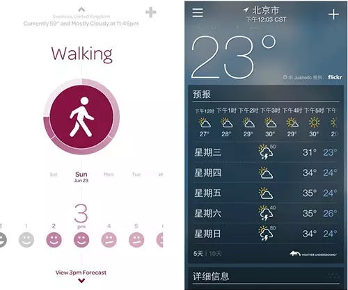 下面的兩個(gè)圖例雖然都以信息的展示為主,但因界面的信息量、app的功能特性因素的影響,左圖的運(yùn)動(dòng)記錄界面信息量比較上,采用了中軸型布局,而右圖的天氣app信息量比較大,采用了滿版型布局。合理的布局選擇對于信息的展示有至關(guān)重要的作用。