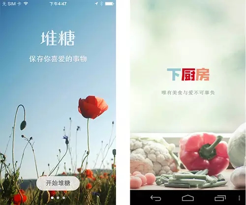 滿版型是用圖片充滿整個(gè)版面,視覺效果直觀而強(qiáng)烈。下面兩個(gè)界面即是采用了滿版型的布局,利用全屏的圖片和簡潔的文案傳遞出產(chǎn)品的氣質(zhì)和理念,同時(shí)給人大方、舒展的感覺。