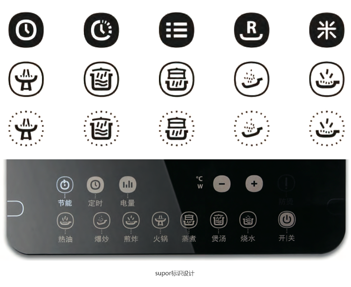 蘇泊爾標識系統(tǒng)吸收了米字格和“永字八法”,將所有圖標元素看作是漢字的八個筆畫,運用八個筆畫元素按照“米字格”的網(wǎng)格系統(tǒng)再組合,設計出蘇泊爾標識系統(tǒng)的所有標識。