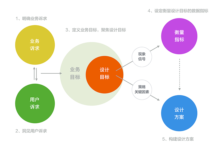 明晰了底層世界觀后,我們團(tuán)隊(duì)逐層向上累積出了我們的方法論,包括thinkflow,workflow,等等,其中最具有代表性的就是剛才提到的《五導(dǎo)家》。五導(dǎo)家是一種設(shè)計(jì)崗位的思考過(guò)程方法論,它包含一個(gè)以目標(biāo)用戶為源頭的5步驟思考路徑,及相關(guān)方法和原則,通過(guò)深度解構(gòu)+全鏈路串聯(lián)的方式,總結(jié)和表達(dá)作為職能部門的UED團(tuán)隊(duì)在設(shè)計(jì)工作中思考路徑的普遍規(guī)律,力爭(zhēng)將原來(lái)那些模糊、零散的概念信息(如業(yè)務(wù)訴求、用戶訴求、業(yè)務(wù)目標(biāo)等)及思考環(huán)節(jié)(如何從訴求到目標(biāo),如何從目標(biāo)到指標(biāo),如何從目標(biāo)到方案等)進(jìn)行串聯(lián)和體系化。