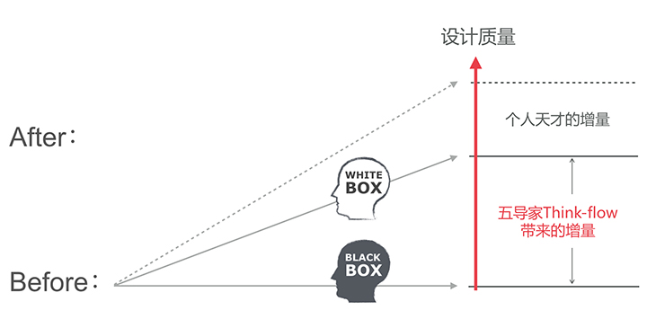 業(yè)務(wù)協(xié)同其實(shí)大家都不難理解,所有UED都在做這樣的事情,保質(zhì)保量的完成業(yè)務(wù)需求,不斷迭代產(chǎn)品進(jìn)度;設(shè)計(jì)增值就有一些難度了,首先要搞清楚如何論證設(shè)計(jì)的價(jià)值,才能說(shuō)出增值有多少,所以針對(duì)這個(gè)問(wèn)題我們打造了頁(yè)面數(shù)據(jù)統(tǒng)計(jì)工具,方便設(shè)計(jì)師、開(kāi)發(fā)、運(yùn)營(yíng)、PD低成本的查看頁(yè)面上線后的數(shù)據(jù)反饋,及時(shí)了解設(shè)計(jì)的結(jié)果。設(shè)計(jì)師要做到增值,我們會(huì)推行《五導(dǎo)家》,常規(guī)來(lái)說(shuō),設(shè)計(jì)師一般接到設(shè)計(jì)需求就進(jìn)入設(shè)計(jì)執(zhí)行階段,中間思考過(guò)程是黑盒,即每次的設(shè)計(jì)都是發(fā)揮不同設(shè)計(jì)師個(gè)體價(jià)值,專業(yè)強(qiáng)的設(shè)計(jì)師輸出作品好一些,普通設(shè)計(jì)師輸出結(jié)果不穩(wěn)定,UED團(tuán)隊(duì)整體輸出品質(zhì)不可預(yù)測(cè),而《五導(dǎo)家》方法就是把設(shè)計(jì)過(guò)程的黑盒變成白盒的過(guò)程,是設(shè)計(jì)師常用方法抽象的5步過(guò)程,是設(shè)計(jì)工作的ThinkFlow。