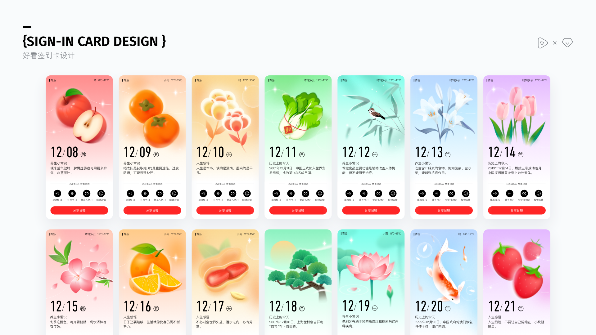 等級(jí)中的簽到是最易完成任務(wù)類型,部分老用戶始終堅(jiān)持簽到,甚至達(dá)到百日以上,表明簽到系統(tǒng)確實(shí)能促進(jìn)用戶留存。因此設(shè)計(jì)上強(qiáng)化了簽到按鈕與簽到后的反饋,并衍生出了新的簽到反饋——日簽卡。日簽卡以彌散清新的風(fēng)格進(jìn)行對(duì)應(yīng)設(shè)計(jì),配合常用的花卉、食材等圖案、文案分別對(duì)應(yīng)中年人愛(ài)看的人生感悟、養(yǎng)生常識(shí)、歷史上的今天,溫馨感十足,上線后還吸引了大量用戶分享保存日簽卡,極大的提升了簽到用戶的次日留存。