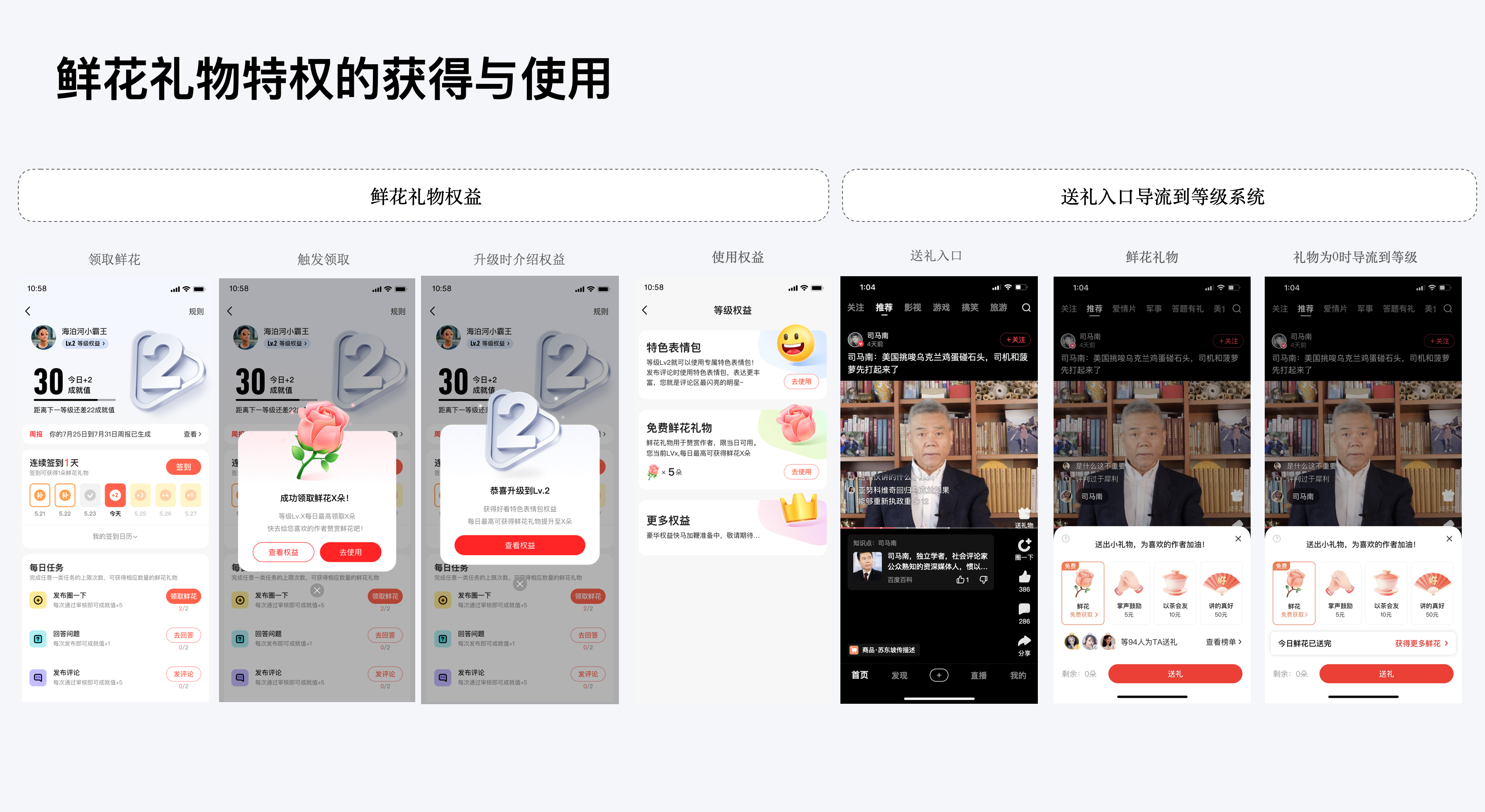 鮮花禮物特權(quán)方面:當(dāng)用戶升級(jí)及完成任務(wù)的同時(shí)可領(lǐng)取該獎(jiǎng)勵(lì),我們采用用戶比較熟知的“授人鮮花,手有余香”的概念,等級(jí)越高可獲得更多鮮花,越能鼓勵(lì)作者,增進(jìn)了創(chuàng)作者與忠實(shí)粉絲之間的關(guān)系。免費(fèi)禮物是好看視頻的首創(chuàng),雙向促進(jìn)用戶與作者激勵(lì),后續(xù)其他平臺(tái)也進(jìn)行了功能跟進(jìn)。在作者的帶動(dòng)下,當(dāng)用戶想給作者贈(zèng)送鮮花時(shí)為了獲取更多的鮮花,也能導(dǎo)流到任務(wù)系統(tǒng)促進(jìn)等級(jí)任務(wù)的完成。