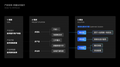 從第一步全盤的信息拆解和歸納, 已經發(fā)現(xiàn)問題, 這一階段主要2點:第一是如何通過設計規(guī)則來避免同樣的問題產生,第二是如何通過簡單的規(guī)則重組減少多人合作記憶復雜度。思路類似于設計一個界面,首先得有一個布局劃分,不同的區(qū)塊要放哪些內容,再到區(qū)塊里的細節(jié)內容規(guī)則,從而抽象出由布局到區(qū)塊的設計規(guī)則和可復用的組件。