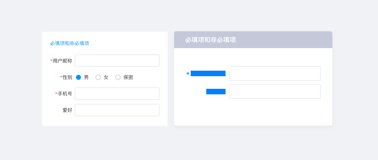 3.必填項(xiàng)指用戶必須要輸入的文本信息, 一般會(huì)用明確顏色凸顯, 非必填項(xiàng)一般是讓用戶選擇是否需要填寫。