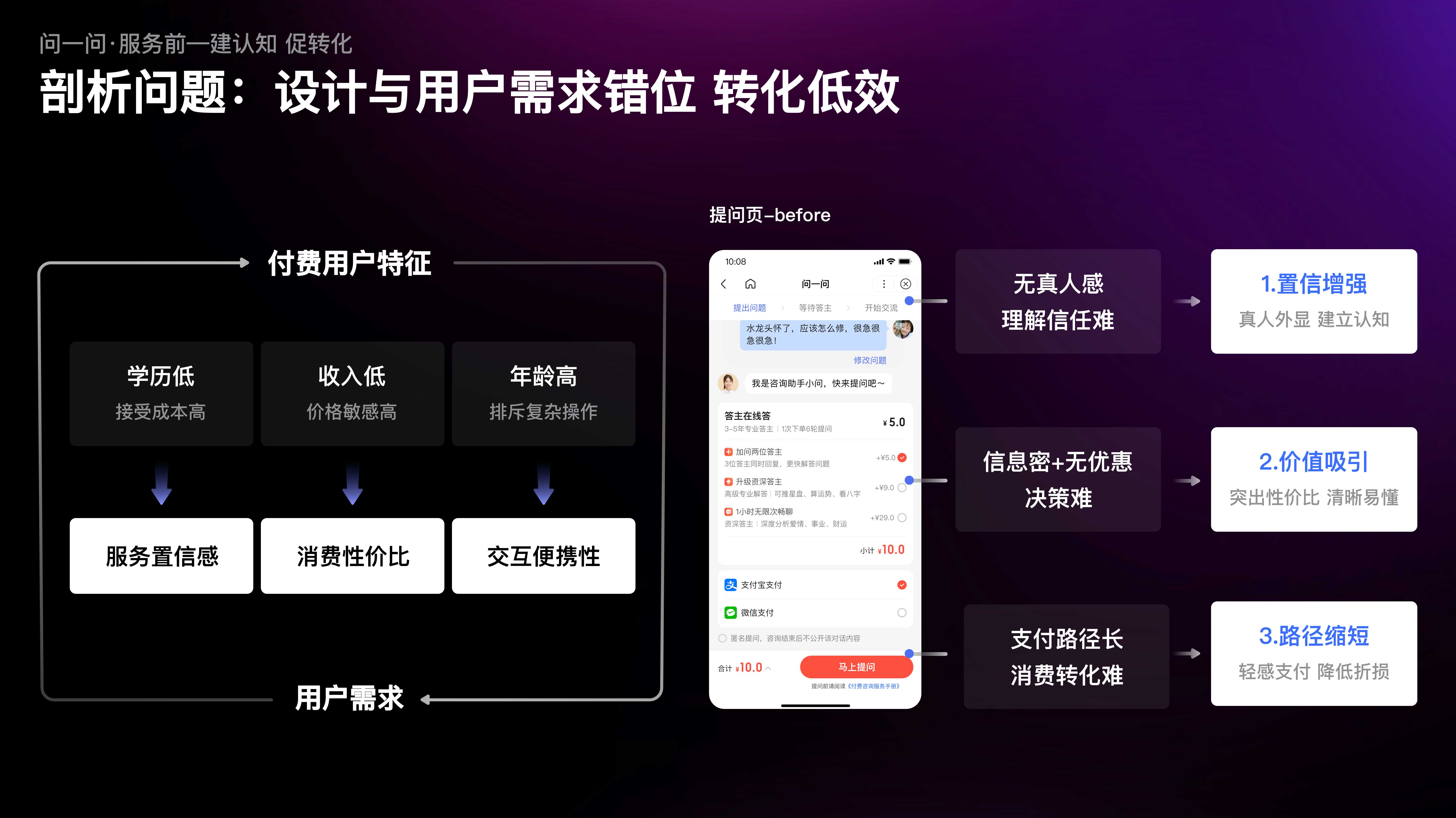 提問(wèn)是服務(wù)閉環(huán)的起點(diǎn),也是業(yè)務(wù)的核心創(chuàng)收?qǐng)鼍啊T谂f版提問(wèn)頁(yè)中,服務(wù)價(jià)值的傳遞與我們“價(jià)格高敏”的主流客群需求發(fā)生錯(cuò)位,服務(wù)的置信感、吸引力、易用性都有提升空間。因此,在新版方案中,我們通過(guò)三大設(shè)計(jì)手段綜合解決:前序鋪墊環(huán)節(jié)多點(diǎn)位透?jìng)髡嫒朔?wù)感知,商品選擇環(huán)節(jié)通過(guò)突出價(jià)值對(duì)比和優(yōu)惠感來(lái)加速?zèng)Q策,壓縮步長(zhǎng)打造輕量支付體驗(yàn)降低付費(fèi)焦慮感。