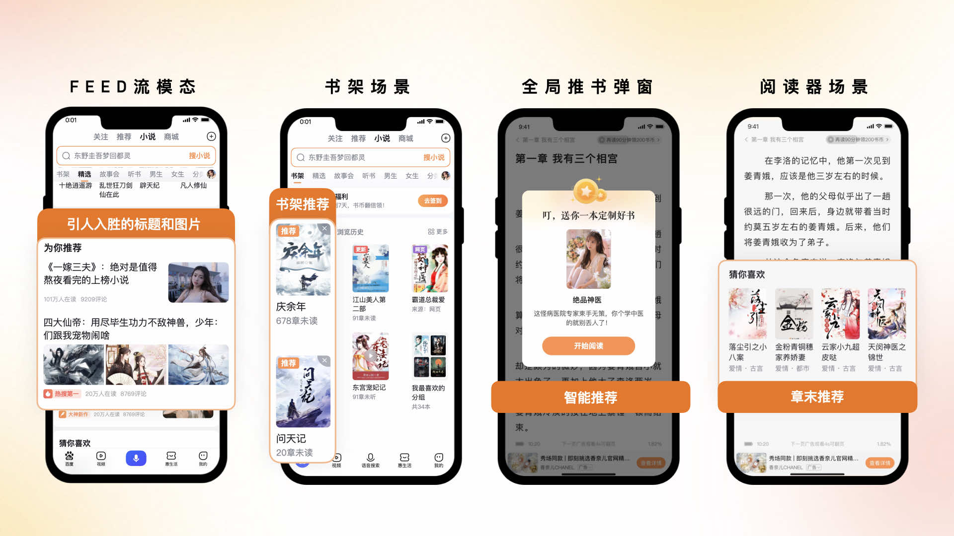 在推薦形式上,我們也采用了多樣化的推薦方式。例如在首頁增加了feed流形態(tài)的信息模塊,以更直觀的圖文展現(xiàn)方式,幫助用戶發(fā)現(xiàn)他感興趣的內(nèi)容。在書架場景,針對于書架內(nèi)容少的用戶,自動的放置兩本高流量書籍,幫助用戶高效的觸達(dá)內(nèi)容。與此同時(shí),我們還會根據(jù)用戶行為數(shù)據(jù),采用彈窗形式和章尾推薦等形式主動向用戶推薦與其喜好度高的內(nèi)容,方便用戶高效的觸達(dá)他感興趣的內(nèi)容。