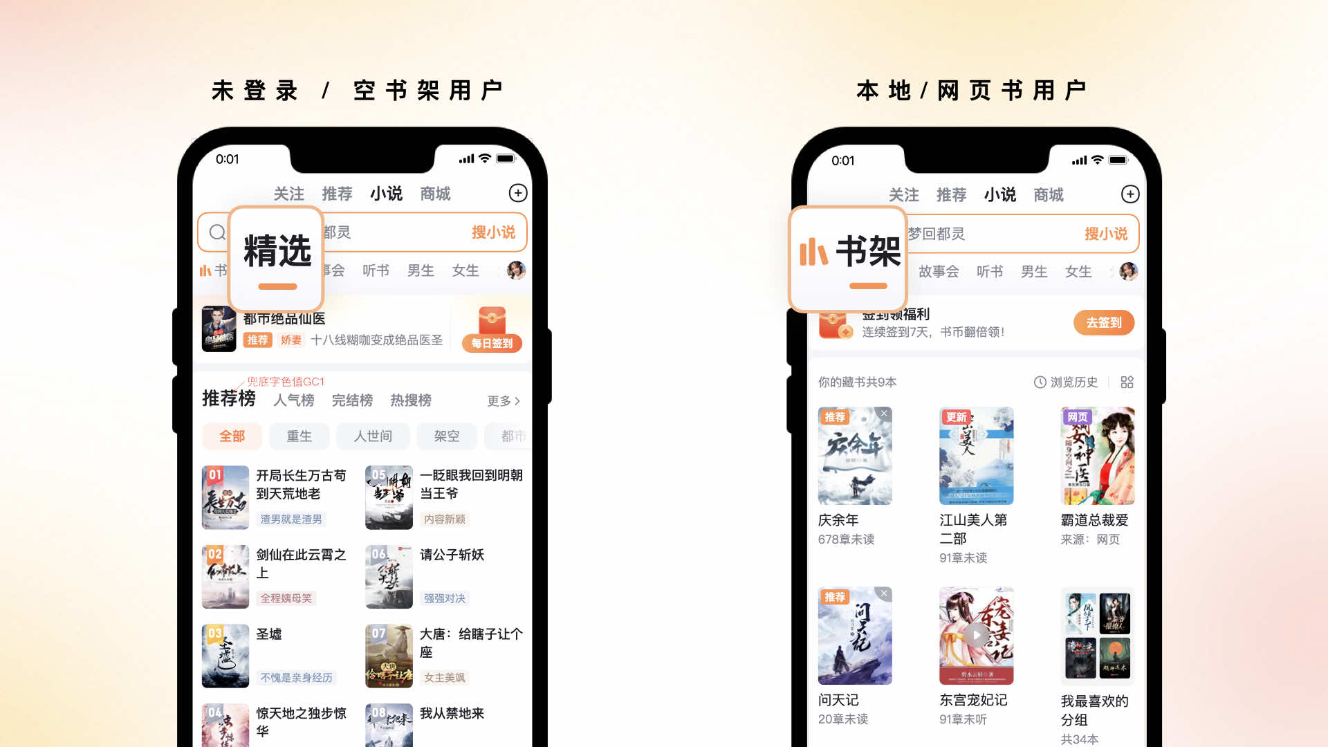 以人為本的設(shè)計(jì)能夠更貼心地滿足用戶的需求和期望,通過關(guān)注用戶的喜好、行為和習(xí)慣,讓用戶體會到關(guān)懷和舒適的享受。因此,針對于不同的用戶行為進(jìn)行了精細(xì)化的設(shè)計(jì)。對于未登錄、書架為空的用戶,我們默認(rèn)為用戶錨定到精選的tab,而針對本地書、網(wǎng)頁書的用戶,我們?yōu)槠涠ㄎ坏綍艿膖ab,方便用戶更精準(zhǔn)的切入場景。