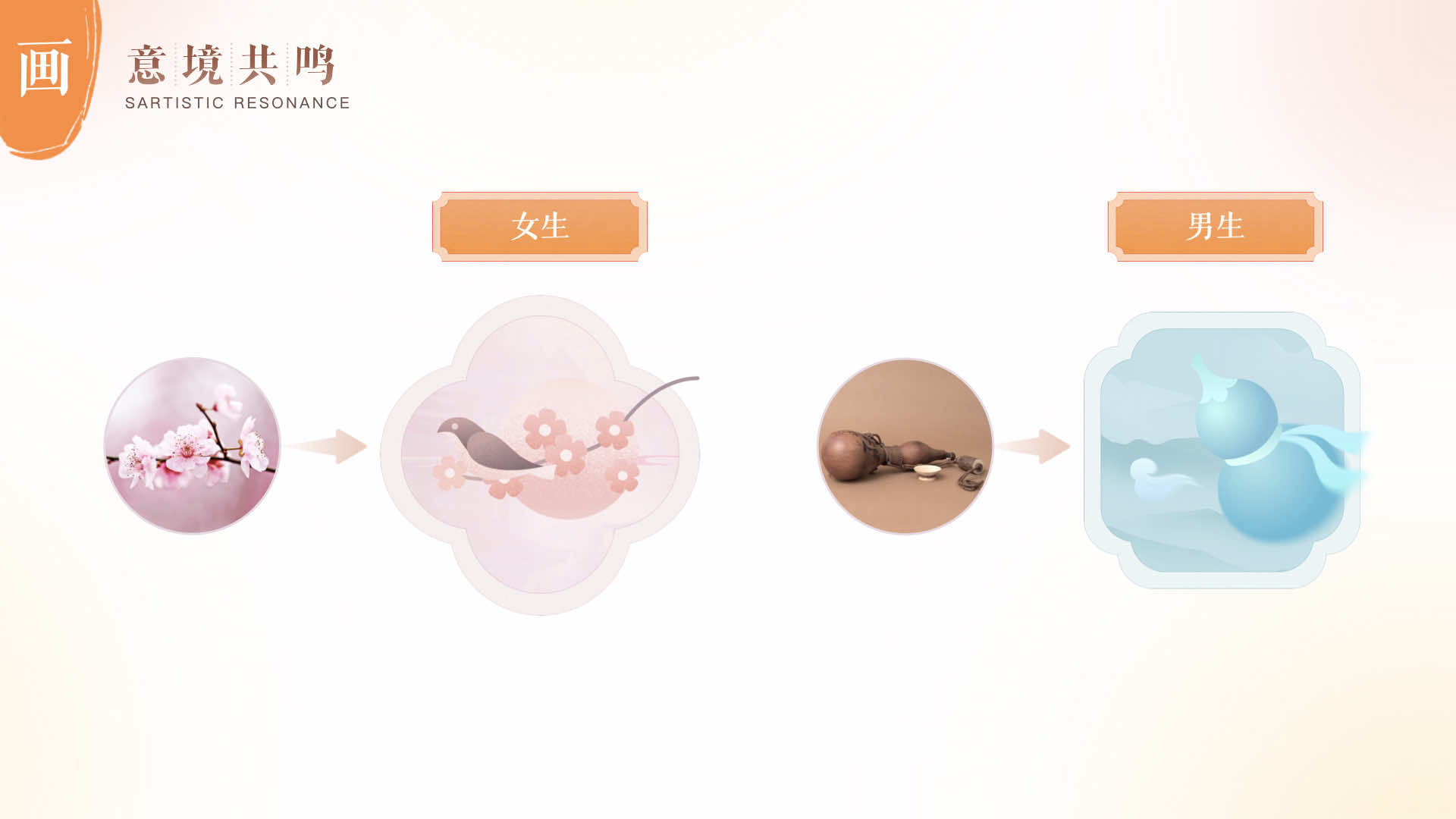 例如,女生的插畫圖形,首先劃分為偏向言情類型,由此聯(lián)想到一只小鳥站在桃花上,整體采用粉色調(diào)的場景進(jìn)行展現(xiàn),夢幻而唯美。男生的插畫圖形則偏向玄幻類型,從而聯(lián)想到葫蘆,由此繪制出葫蘆和浮云結(jié)合的畫面,自由而飄逸。