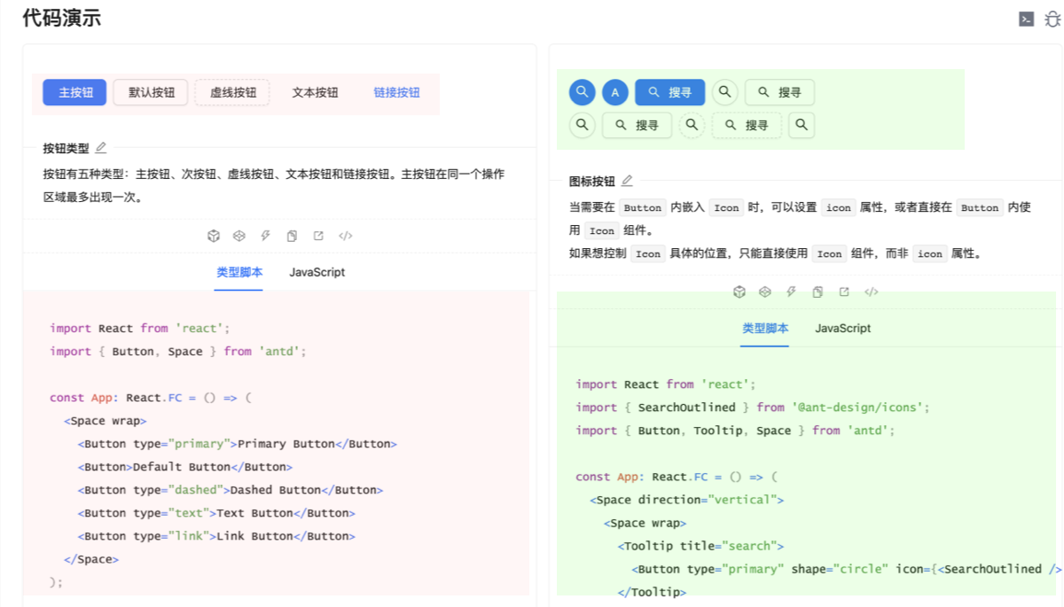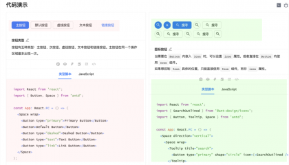 組件和組件庫的設(shè)計和搭建過程中,需要了解系統(tǒng)平臺,是蘋果端還是安卓,web端,不同的系統(tǒng)設(shè)計的差異性很大,對應(yīng)系統(tǒng)的控件類型我們也要很熟練的掌握。例如安卓一直保留的原生的底部導(dǎo)航欄的操作控件(返回、主頁、菜單),反觀蘋果最早出現(xiàn)在底部的HOME鍵,隨著硬件設(shè)計的升級,物理按鈕的作用已經(jīng)完全被交互手勢操作替代,根據(jù)設(shè)計準則,可以先設(shè)計出確定的初版組件樣式,然后設(shè)計師們要熟悉項目業(yè)務(wù),深挖每個功能中的不同業(yè)務(wù)場景,并設(shè)計出對應(yīng)的業(yè)務(wù)組件;這樣設(shè)計師最終對于當前組件進行整合分類,做出版本的組件庫;組件和組件庫是設(shè)計和開發(fā)相結(jié)合的,設(shè)計師呈現(xiàn)頁面上的模塊是直觀的,但都是技術(shù)人員進行底層代碼拼接的再封裝而成的,有規(guī)模的公司一般都會做成開源的組件庫。去提升項目人員之間的協(xié)作效率,復(fù)用率高,節(jié)省成本。如下圖是Ant design里面的部分按鈕組件的樣式和代碼演示,作為國內(nèi)獨一檔的免費學(xué)習(xí)的設(shè)計體系網(wǎng)站。如果大家能夠從頭到尾研究一遍,相信對你構(gòu)建組件和組件庫有十分大的幫助。