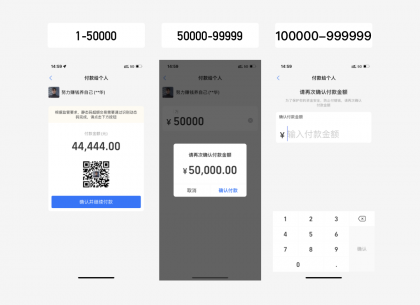 業(yè)務(wù)場景123主要應(yīng)用金額輸入框組件,輸入框組件根據(jù)用戶操作行為,會有不一樣的設(shè)計,用戶沒有任何操作,輸入框內(nèi)有默認文案提示“輸入付款金額”,用戶輸入金額后,計算單位超過‘百’,數(shù)字金額上方會有單位提示,同時顯示刪除按鈕,支持刪除,重新輸入,業(yè)務(wù)場景2中根據(jù)金額輸入范圍定義了產(chǎn)品業(yè)務(wù)規(guī)則,再細分出三種場景,不同范圍內(nèi)的金額,可以對應(yīng)的組件設(shè)計方案解決確認轉(zhuǎn)賬確認問題;