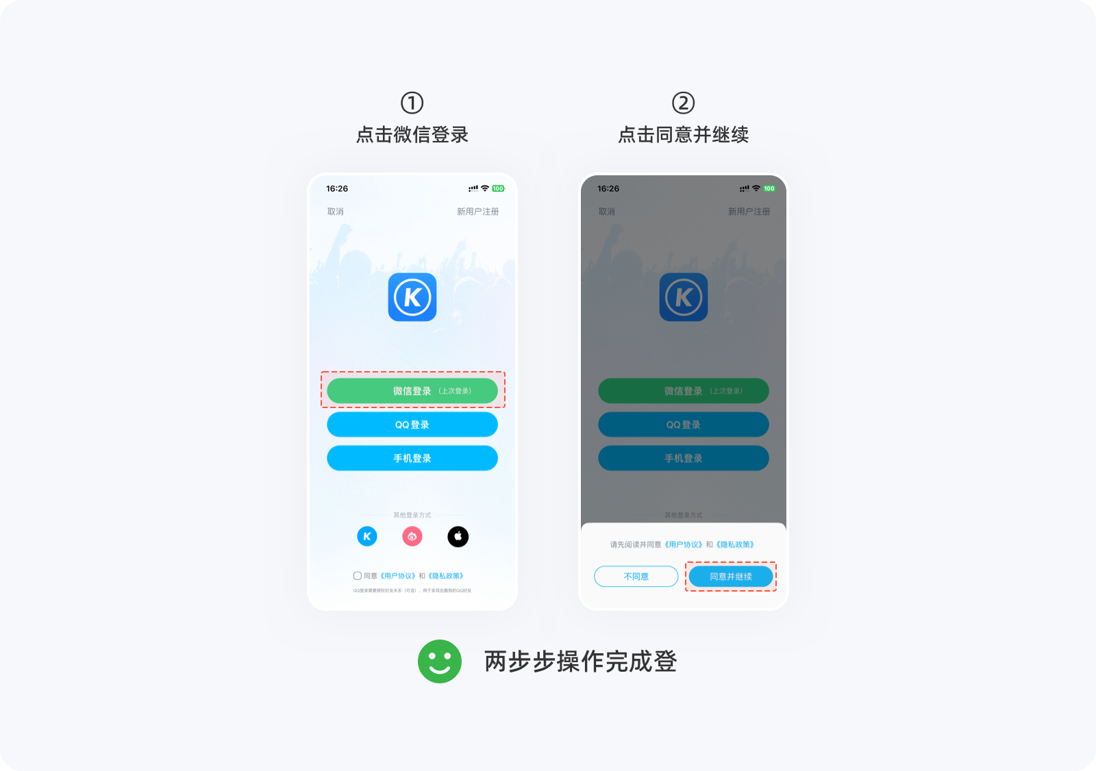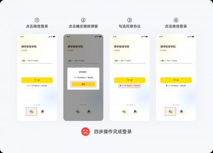 用戶在進行一個任務時,提升任務完成率最好的辦法就是避免復雜,任何一個流程,能用N次操作解決的事情,就不要用N+1次操作來完成,讓用戶以最少的點擊次數(shù)就能完成任務,以提升用戶對產(chǎn)品的滿意度與忠誠度。下圖是用戶登錄未勾選「用戶服務協(xié)議」,圖1、圖2分別給出了不同的交互流程,顯然,圖2的操作次數(shù)更少,讓登錄變的更容易完成。在設計一個功能時,如果存在多種交互方案,那么最簡單那個肯定是最好的。▽圖1:四步操作完成登錄