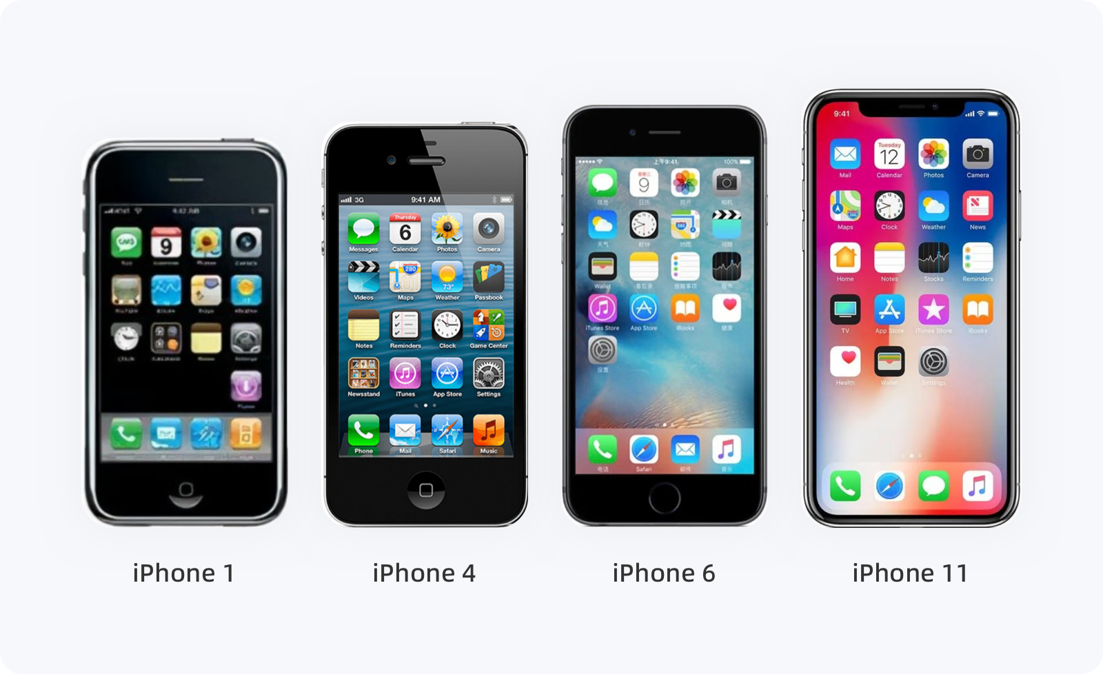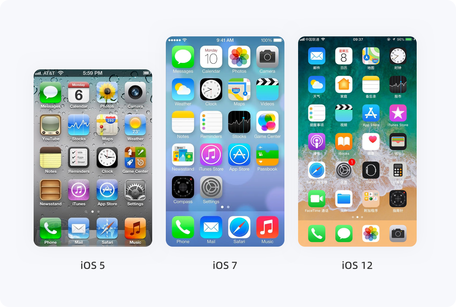 當2007年 iPhone Runs OS X(iOS 1 系統(tǒng))出現(xiàn)時,應用界面和操作上跟現(xiàn)在的系統(tǒng)很像,里面也有了郵件、日歷、照片、時鐘、文本、Safari、便箋等應用。流暢的動畫、多點觸控的交互方式、簡潔的UI足以顛覆人們對于傳統(tǒng)意義上手機界面的認識。隨后,iOS 系統(tǒng)每次新版本的出現(xiàn),都有一些變化,但與iOS 7 相比,就是小巫見大巫了。2013年,iOS 7 的發(fā)布,是迄今為止 iOS 系統(tǒng)史上設計風格的最大一次升級,UI設計由之前的擬物化轉向扁平化,整個系統(tǒng)外觀看起來十分簡潔,新增的指紋解鎖、控制中心設置快速切換、中國人喜愛的九宮格輸入法,以及簡化的圖標、交互的過渡動畫等,基本上每一各元素都在根據(jù)用戶的操作及行為習慣發(fā)生變化。毫不夸張的說,iOS 7 系統(tǒng)改變了近十年的設計風格,設計趨勢也正式從擬物化(復雜)時代走向扁平化(簡約)時代。iOS 12 在設計上雖然沒有太大變化,但系統(tǒng)的流暢度相對提升了很多,例如相機啟動速度提升70%、App啟動速度提升40%,新增勿擾模式、密碼自動填充等,包括后面 iOS 13 更加省電、面部解鎖速度提升、安裝包/更新包內層變小等,無一不是在將事情變的更簡單、更容易。