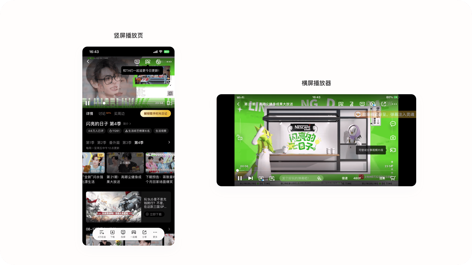 3.1豎屏播放頁豎屏播放頁為用戶點擊進入視頻的第一個場景,主要功能為:頂部播放器:頂部為視頻播放區(qū)域詳情:詳情中包含視頻標題、選集、討論、周邊、視頻推薦等功能底部快捷操作區(qū):包含再追、下載、投屏、一起看、分享等功能