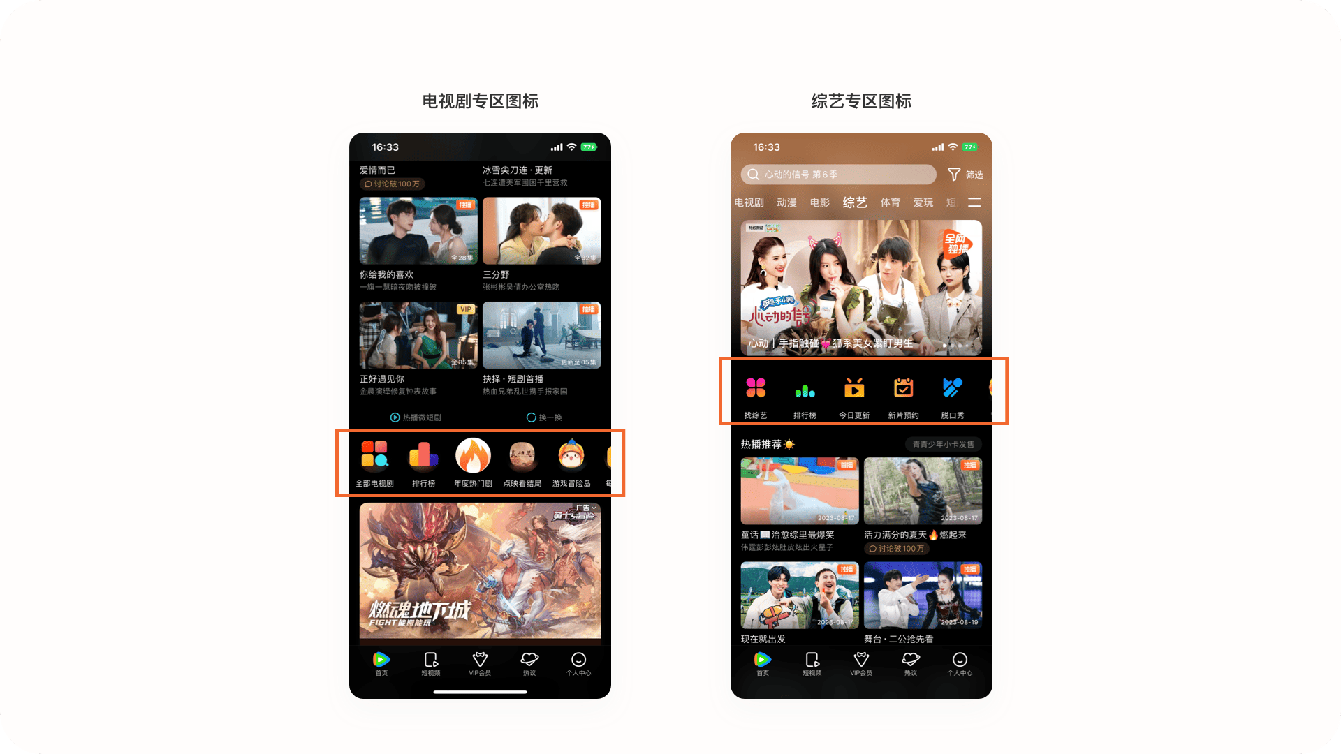 2.2.5設計誤區(qū):分區(qū)中的入口icon設計電視劇作為騰訊視頻的高頻點擊分區(qū),在頭部的icon確實有失大廠風范,圖標過大、視覺比例不一致、風格不統(tǒng)一等問題,很影響界面的視覺美感,但入口的點擊轉化是否有影響未知。