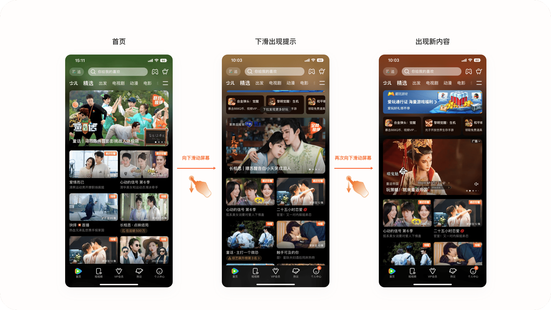 2.1.5設計亮點:下拉刷新新玩法大多數(shù)產品下拉都為刷新界面操作,但騰訊視頻對下拉進行兩部交互操作,用戶下拉到第一個階段會出現(xiàn)提示"下拉發(fā)現(xiàn)更多好玩"當前這時用戶松手可以進行常規(guī)刷新操作, 但用戶看到這樣的提示會更想知道在向下拉到會帶來怎么的內容,當用戶再次下拉后會出現(xiàn)對應的內容推薦,類似于游戲推廣與熱播劇推廣,賦予用戶驚喜感的同時還能增加廣告收入。