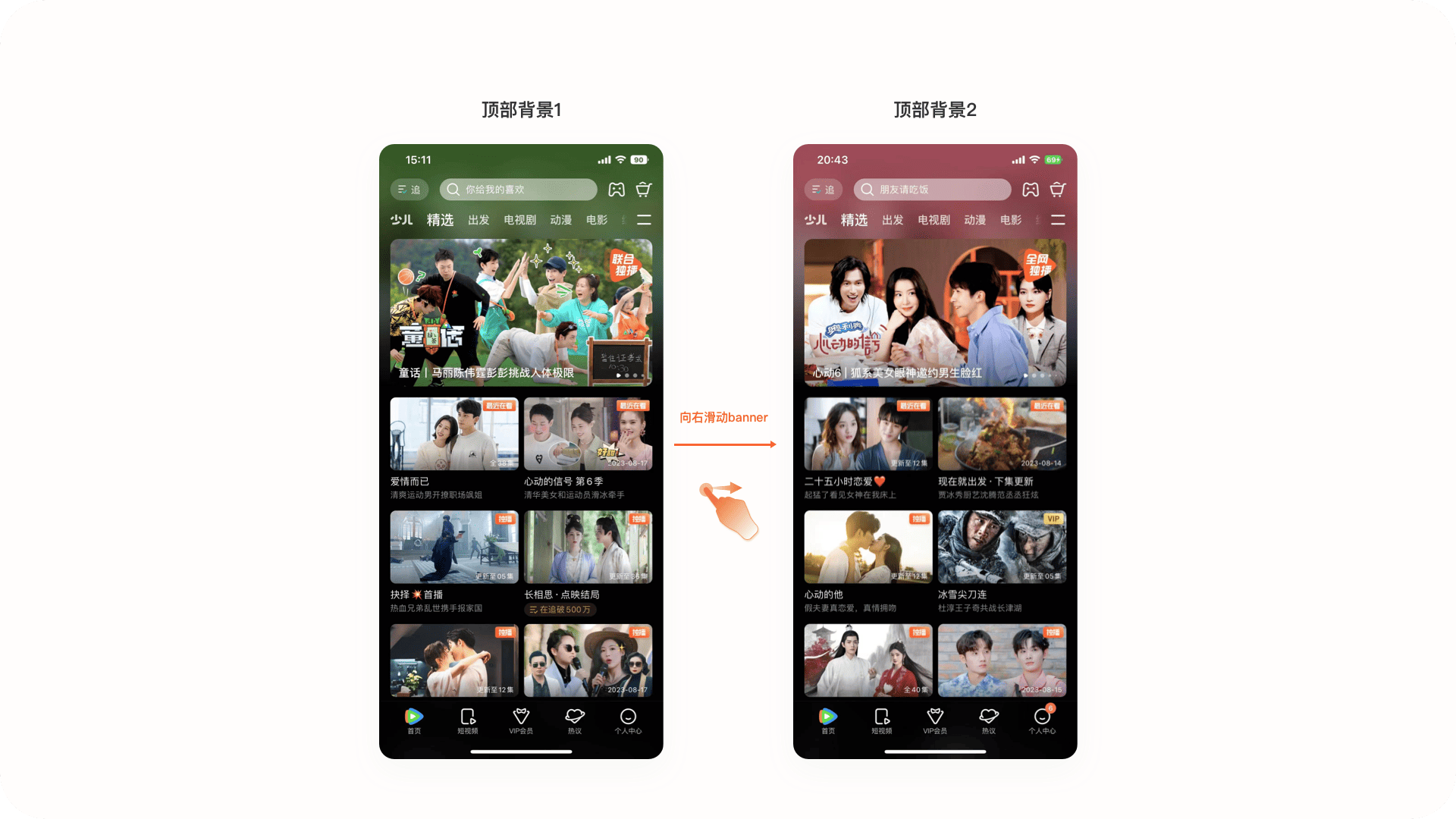 2.1.4設計亮點:頂部背景跟隨banner顏色進行變化頂部背景跟隨banner進行變化,當用戶滑動banner時頂部背景會跟隨banner的顏色進行變化,這樣可以讓界面的配色看起來更加和諧,提升界面視覺一致性。同時賦予用戶體驗驚喜感。