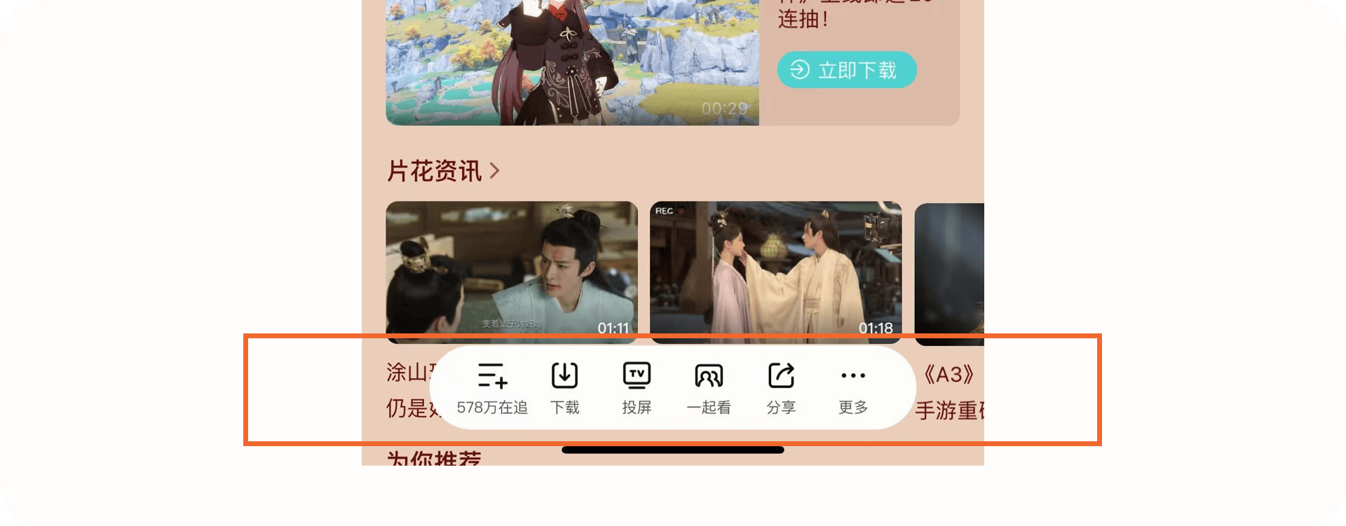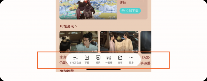 3.1.2產品亮點:底部操作區(qū)功能相比其他產品,騰訊視頻在進入豎屏播放頁后不會再頂部的視頻中默認展示操作內容,給用戶帶來更好的觀看體驗,并且把視頻相關的操作內容放置底部做成一個底部操作區(qū),用戶可以在底部快速的對視頻進行操作如:下載、投屏、一起看、分享等。而不是把功能分散在界面中,這樣不僅可以降低用戶的尋找這些高頻操作的成本,同時提升視頻的觀看體驗。