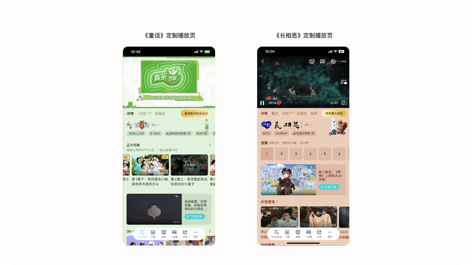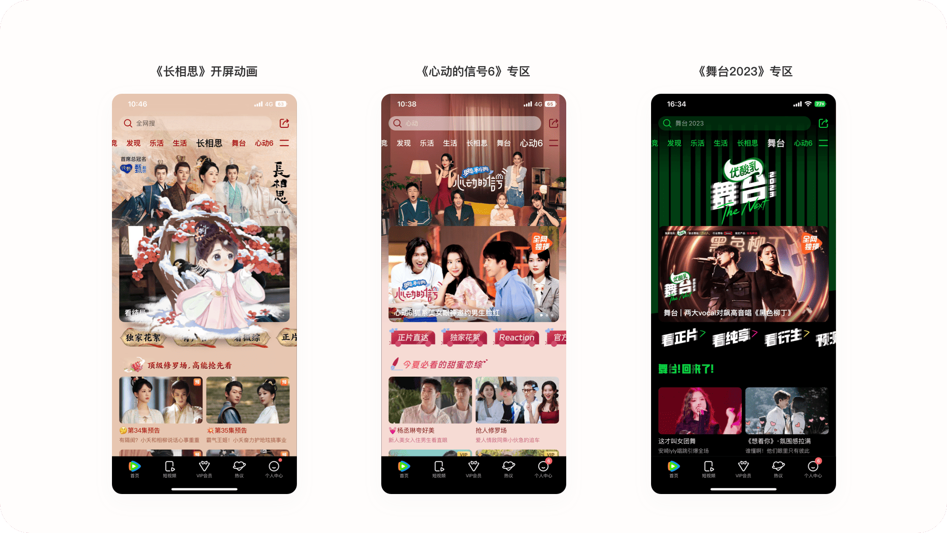 2.2.4設計亮點:不一樣的定制化分區(qū)內容頁騰訊視頻會根據(jù)站內的熱門內容進行定制化分區(qū)內容頁,雖然這種形式在各個視頻平臺都有設計,但騰訊視頻的似乎更加與眾不同,它相比其他競品不僅增加了開屏動畫,加強界面氛圍感,同時在功能上增加了一級標題,如在長相思專題中的“獨家花絮、有聲書、看微綜、相思榜”等入口,可以讓用戶在頁面中發(fā)現(xiàn)更多劇情本身以外的衍生內容,一級標題的形式也可以讓用戶直達視頻播放頁,快速了解想要看到的視頻內容。