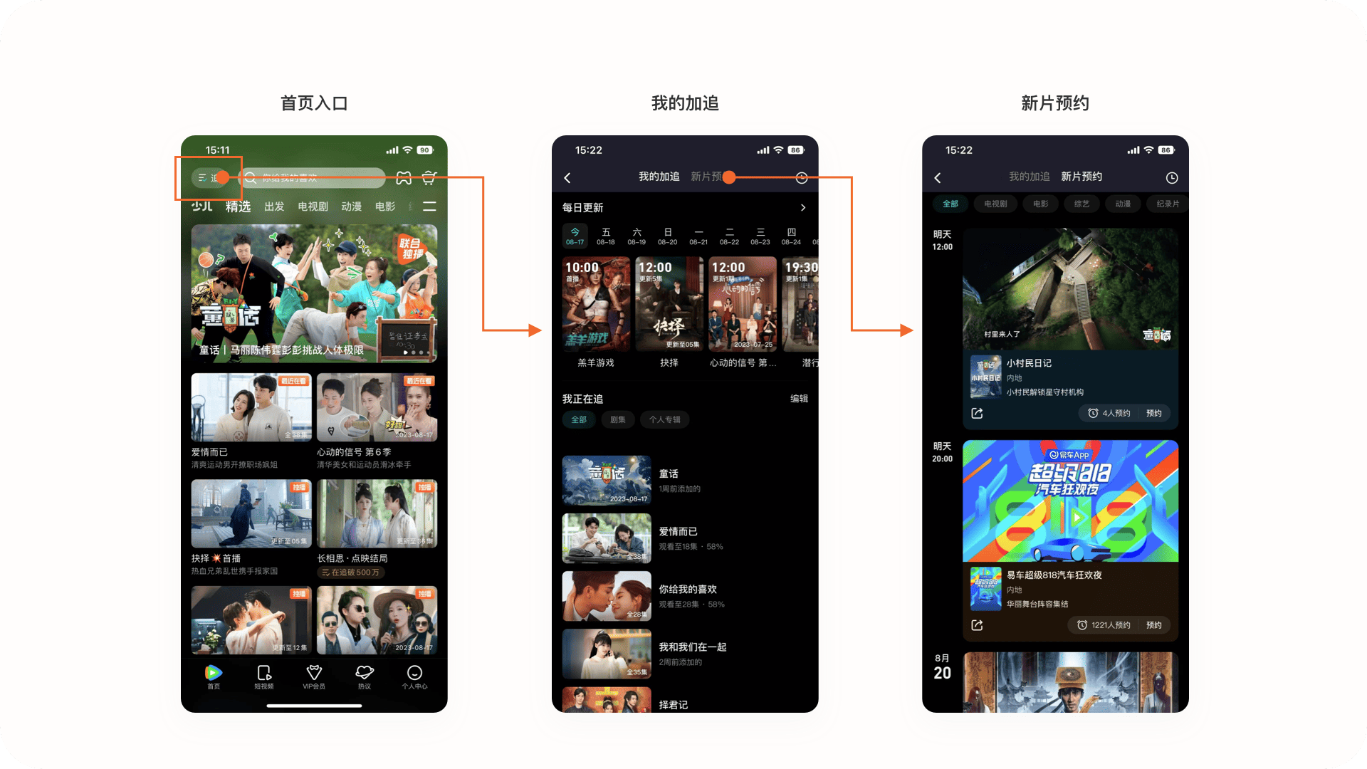 2.1.1產品亮點:加追與預約功能在首頁左上角增加最近再追功能,此功能讓用戶在首頁就可以更快速的找到自己在追的內容,而且在頁面中還包含新片預約和歷史瀏覽記錄功能,讓用戶在了解更多預約內容與歷史記錄。此功能放在首頁很好的降低用戶操作成本,提升產品體驗。
