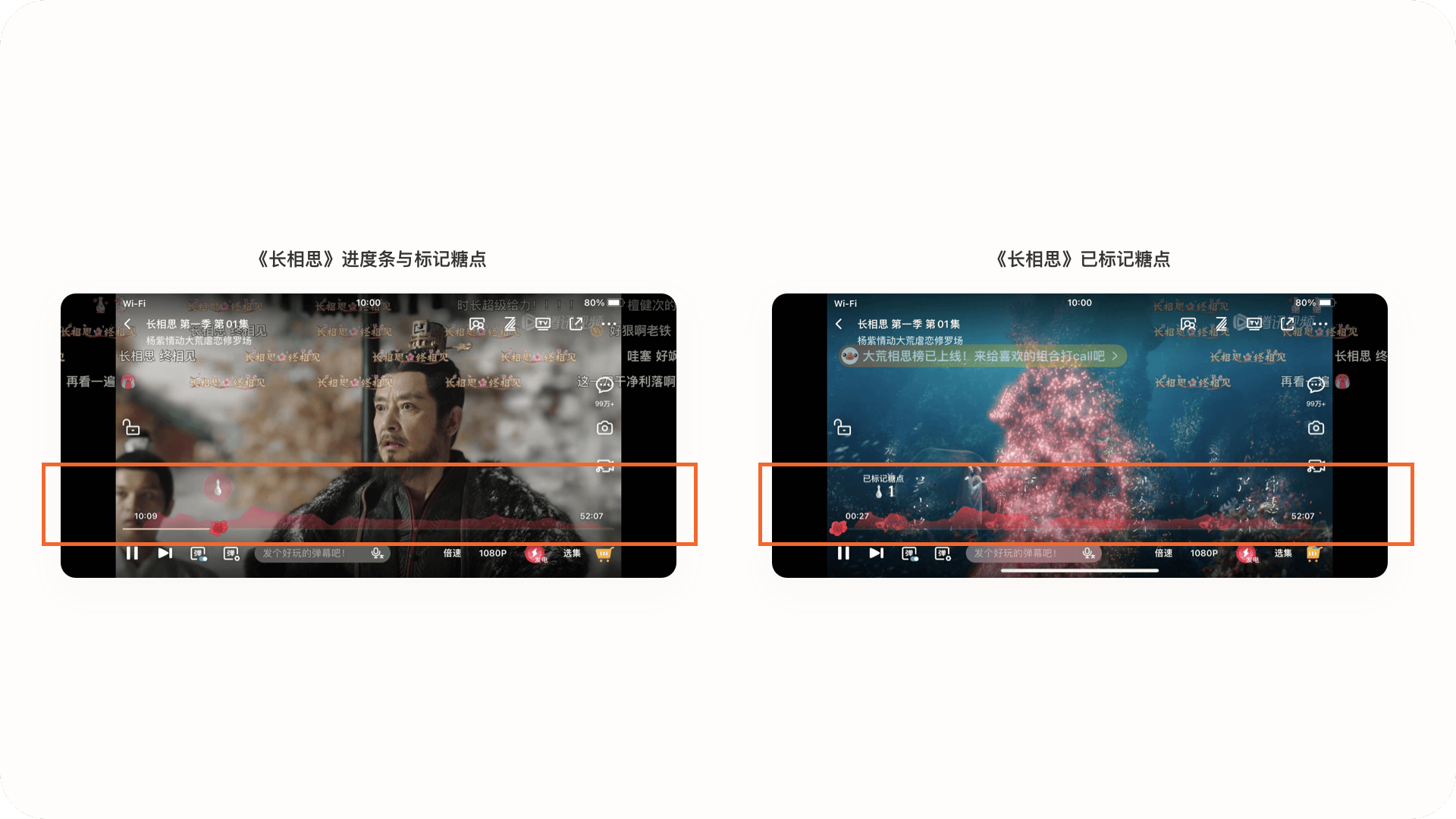 3.2.1設計亮點:定制化進度條與標記糖點對應熱門視頻內容,騰訊視頻會定制化進度條樣式與進度點樣式,(如《長相思》中定制紅色木槿花)讓用戶更加沉浸的觀看體驗,同時在進度條上方有標記樣式,用戶點擊會觸發(fā)標記動效與糖點,所有標記的糖點數(shù)據(jù)也會以波動圖的形式顯示在進度條上方,提高互動玩法。