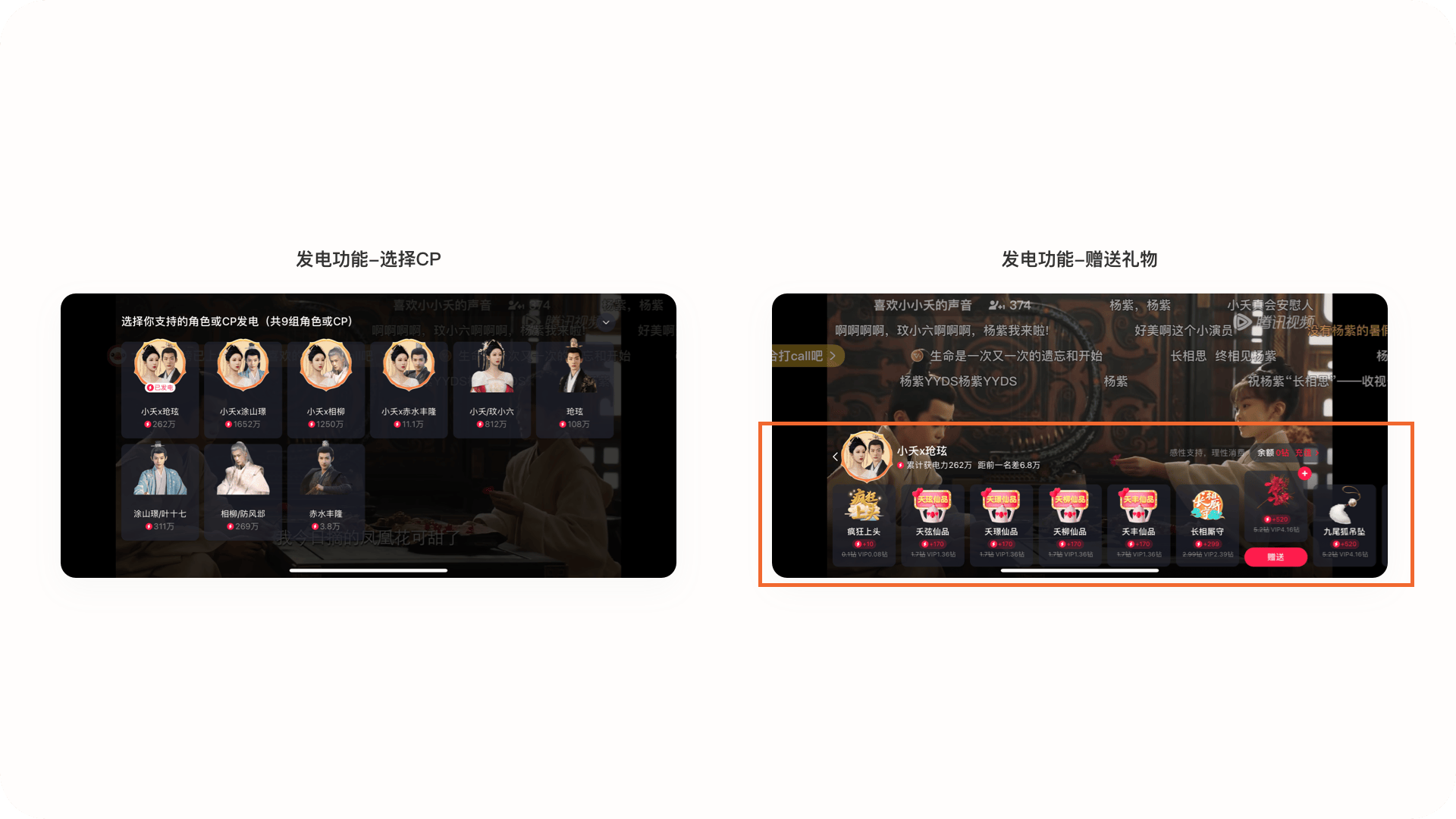3.2.2產品亮點:發(fā)電功能為自己支持的CP上分在底部操作區(qū)增加發(fā)電功能,用戶可以點擊為自己支持的cp送出禮物,不僅可以滿足用戶的“嗑CP”心理,同時對直播場景中的核心送禮功能很好的結合到視頻產品中,給視頻內容提供了商業(yè)價值,提高產品收入。