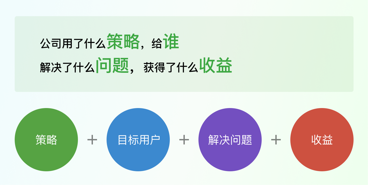 到此先做個小結(jié):① 了解公司盈利和運作的公式:公司用了什么策略,給誰,解決了什么問題,獲得了什么收益