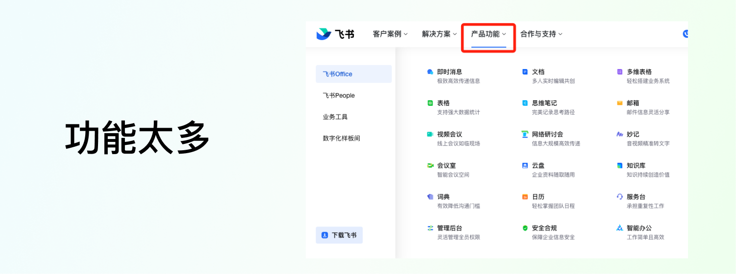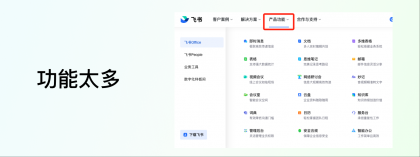 去哪里了解呢?一般企業(yè)官網(wǎng)都會把自家產(chǎn)品列出來,方便客戶查看,咱們也可以順著這條路線去走。就拿飛書舉例,從導(dǎo)航欄的“產(chǎn)品功能”我們可以看到,主要是四條線,咱們不用把每條線都挖得很細致,但是起碼要有大概的認知,知道這是個什么東西,做什么的,最好上手體驗體驗。