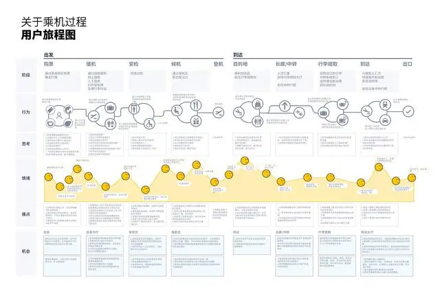 用戶旅程圖是一種圖形化工具,用于詳細(xì)描述用戶在使用產(chǎn)品或服務(wù)時(shí)所經(jīng)歷的各個(gè)階段和步驟。它能夠展示用戶的整個(gè)使用過程,包括用戶的需求、痛點(diǎn)、態(tài)度和行為,以及產(chǎn)品或服務(wù)如何與用戶進(jìn)行互動(dòng)。作為產(chǎn)品設(shè)計(jì)者,我們可以通過用戶旅程圖更好地理解用戶需求,提前發(fā)現(xiàn)后續(xù)的用戶體驗(yàn)問題,并思考如何提升產(chǎn)品或服務(wù)的用戶體驗(yàn)。