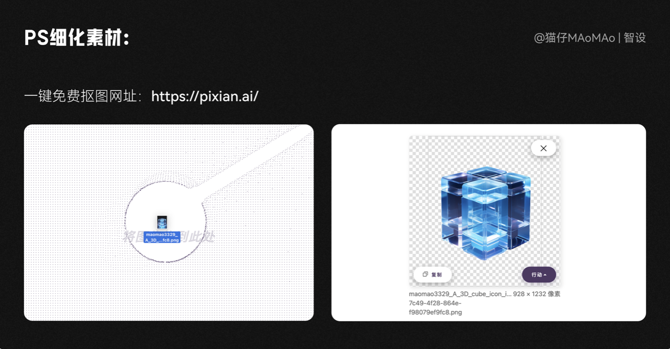 3D主視覺的部分,我們需要先進(jìn)行摳圖,如果不想使用 PS 手動(dòng)摳圖,這里推薦我常用的一鍵免費(fèi)摳圖網(wǎng)站:https://pixian.ai/ ,處理簡單的圖片,直接把圖片扔進(jìn)去就好了,簡單好用~