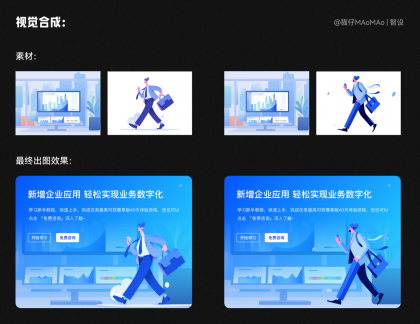 這一步考驗(yàn)的是設(shè)計(jì)師的審美和手活,我們需要把背景和主視覺素材,進(jìn)行視覺合成,其實(shí)也非常簡單:這里我定的主要色調(diào)是藍(lán)色+青色的光感,首先需要將色調(diào)整體統(tǒng)一;然后想要表現(xiàn)出玻璃質(zhì)感的通透,我們需要加上一些光感;最后文字排版出圖即可~