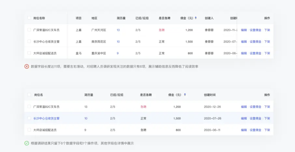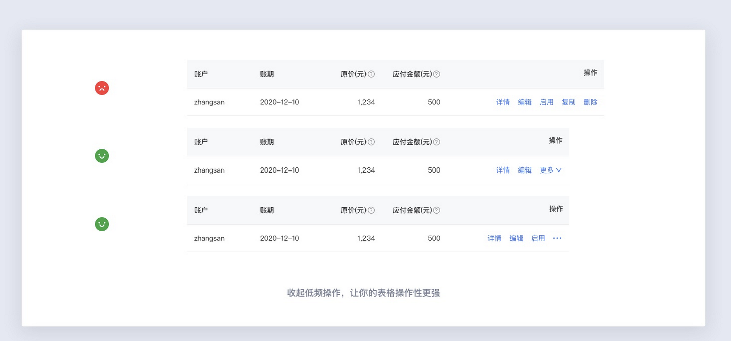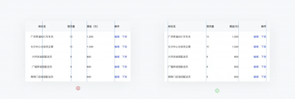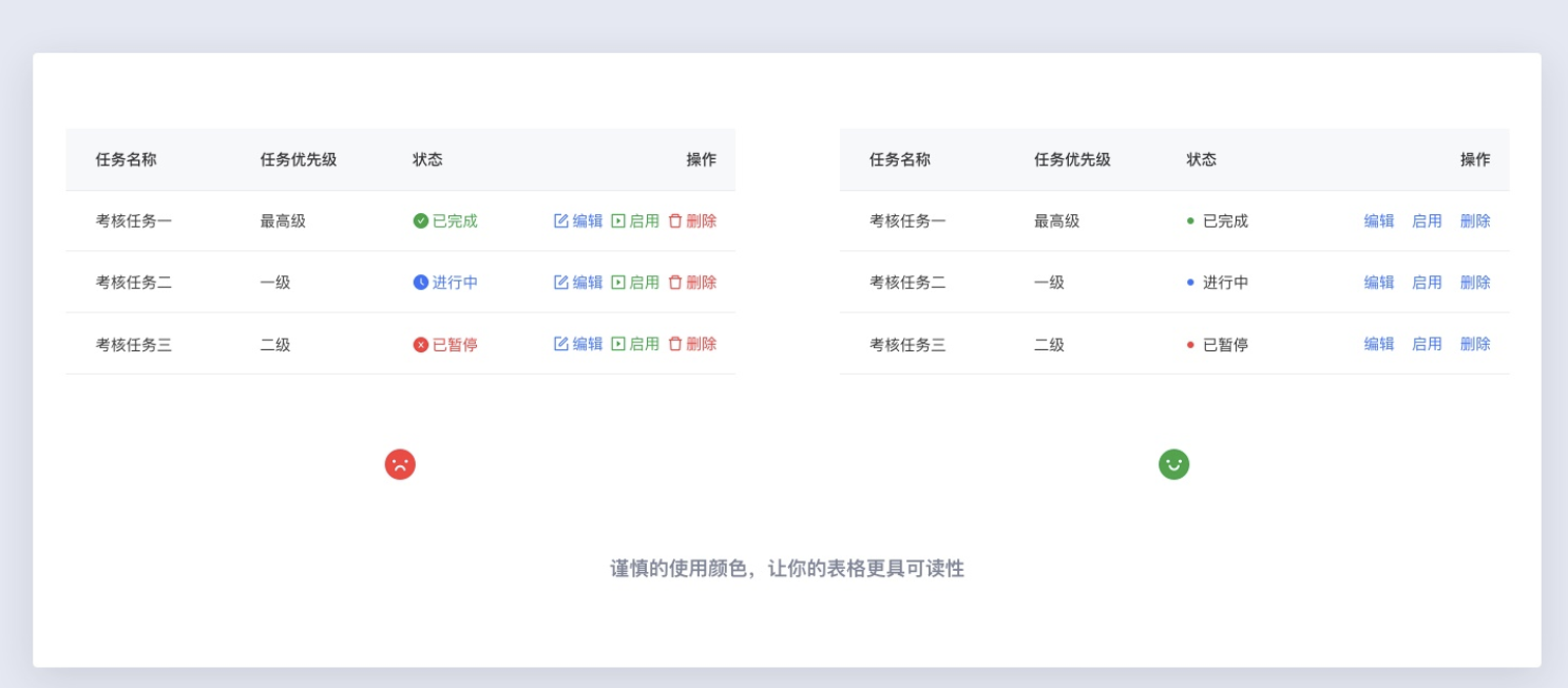 表格設(shè)計中一定不要使用過多的顏色區(qū)做狀態(tài)或操作的區(qū)分,過多的顏色細分會使表格變得更加混亂,影響用戶體驗。對狀態(tài)的區(qū)分,僅用輕量的顏色區(qū)分即可,操作欄保持主色按鈕色。