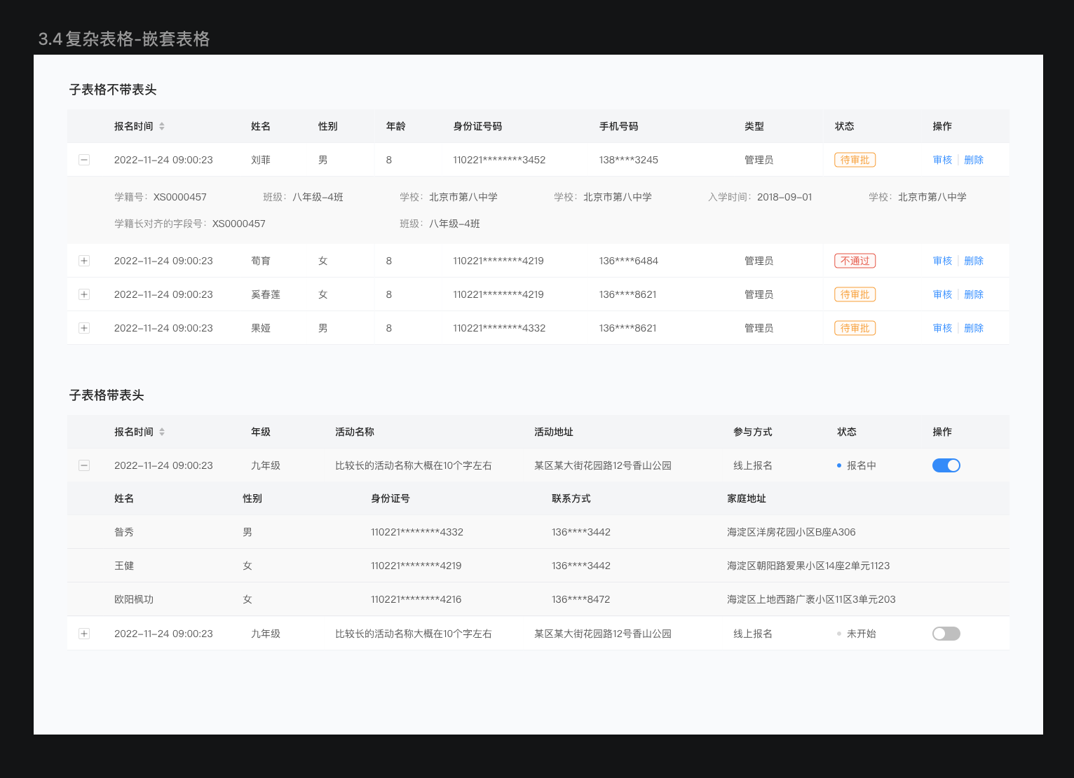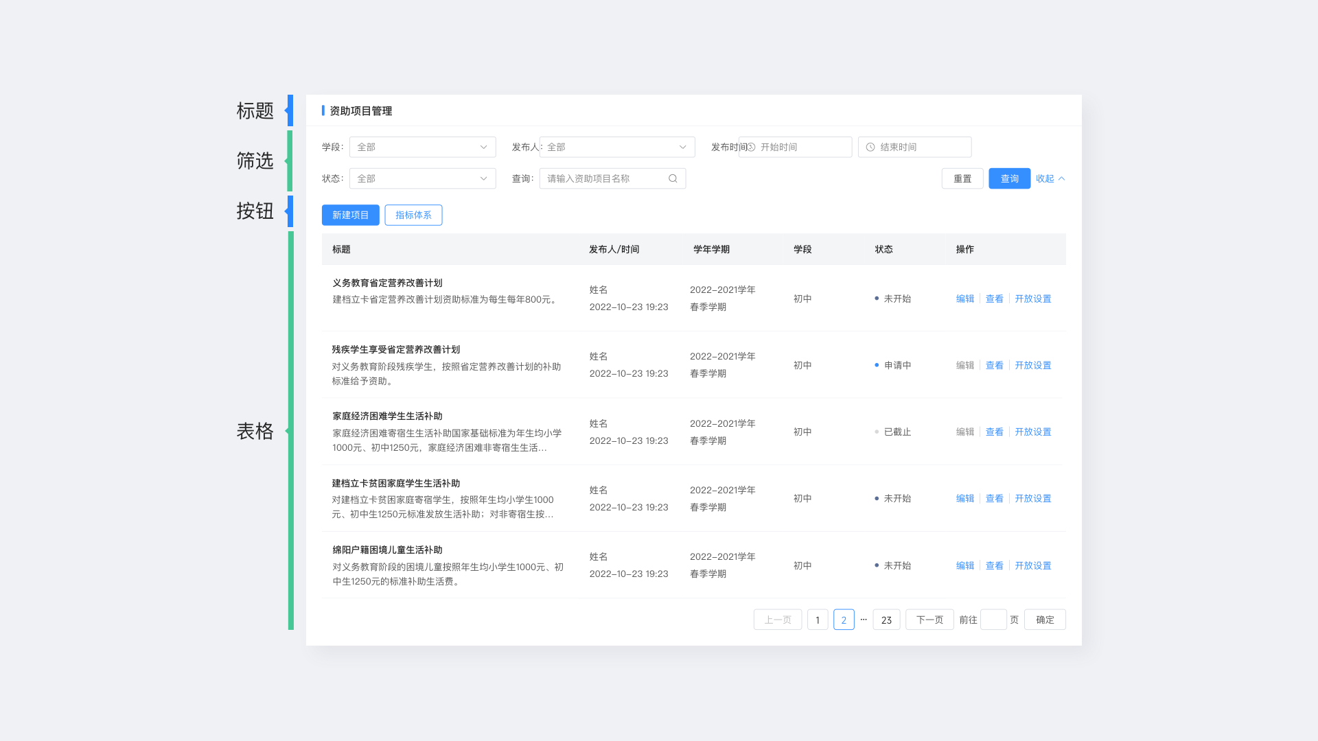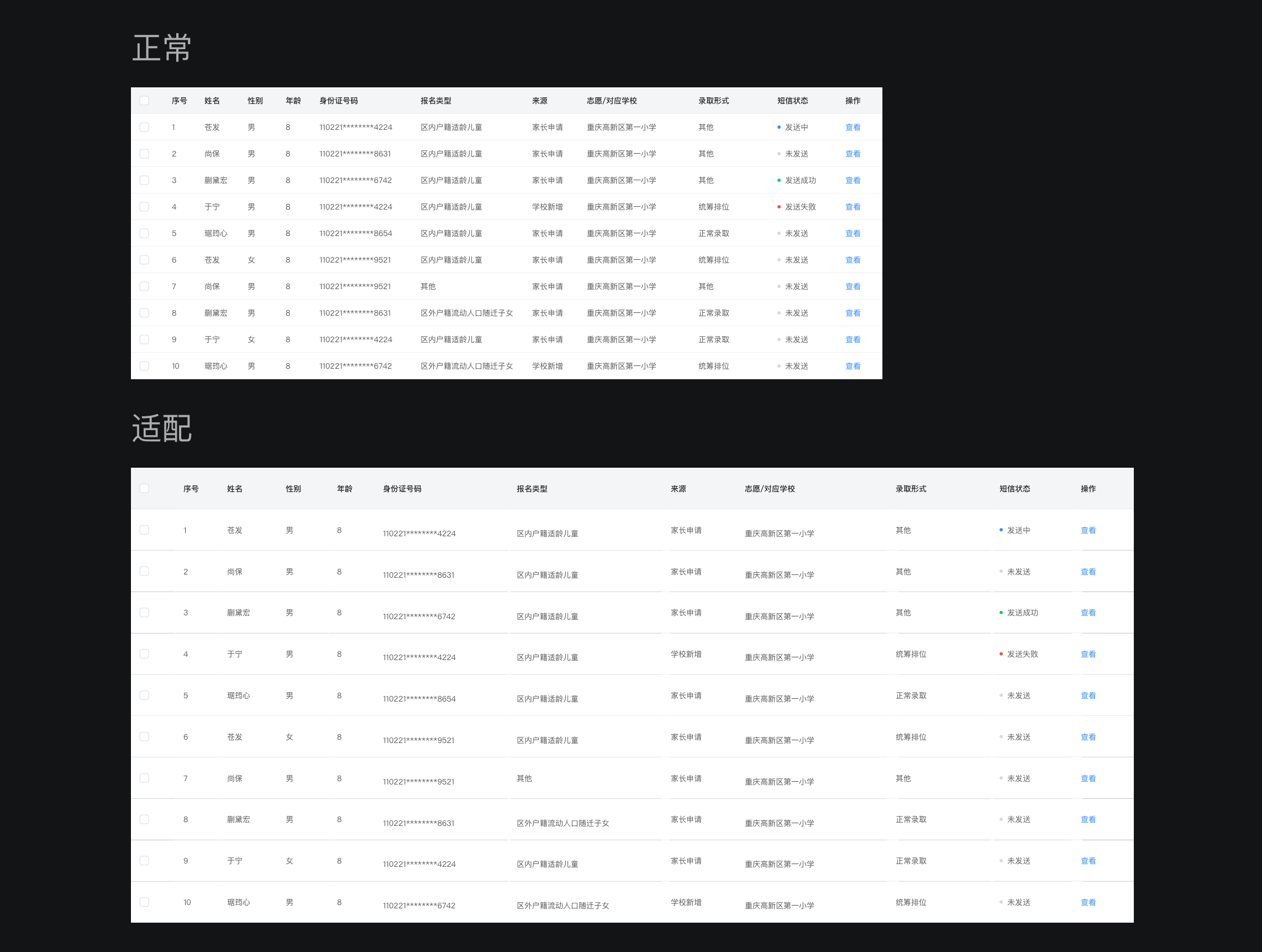 表格設(shè)計中一定不要使用過多的顏色區(qū)做狀態(tài)或操作的區(qū)分,過多的顏色細分會使表格變得更加混亂,影響用戶體驗。對狀態(tài)的區(qū)分,僅用輕量的顏色區(qū)分即可,操作欄保持主色按鈕色。