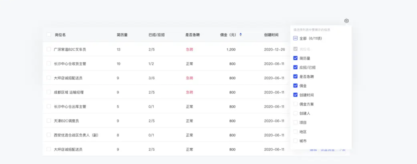 如果不同用戶想看到的信息側(cè)重不同,可以讓用戶自定義列的展示。在默認情況下僅展示最常用、最重要的幾個指標(如下圖)。這樣做的好處是:首先,用戶能在表格上方看到所有的指標名稱,避免了原來需要橫向拖拽才能瀏覽到所有指標的情況;其次,用戶可以根據(jù)自己的需要,自由的選擇顯示所需指標,隱藏不必要指標,減少干擾。但需注意系統(tǒng)應(yīng)記住用戶上一次的自定義列設(shè)置,減少用戶重復(fù)操作。