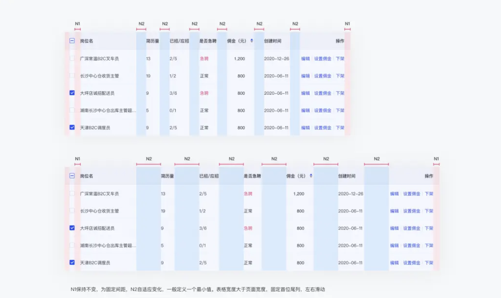 合適的填充和邊距對于視覺設(shè)計至關(guān)重要,以保證易讀性。定義列的間距時,我通常的做法是N1保持不變,將N2定義一個最小值,N2再根據(jù)表格的寬度自適應(yīng)變化。表格主要適配到這個最小寬度,這一步驟通常的設(shè)計系統(tǒng)的初期就要完成,一方面可根據(jù)自己項目目前情況,按照導(dǎo)航寬度等固定尺寸確定最小的表格寬度,這樣在處理最小尺寸時,可以有一個明確的邊界,同時能與開發(fā)同學(xué)進行理解溝通。當(dāng)表格寬度大于頁面寬度,固定首尾列,左右滑動。