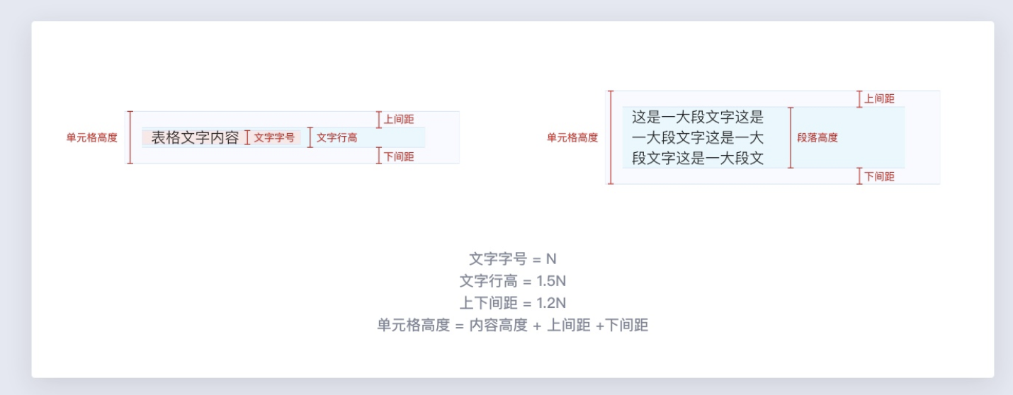 在開發(fā)同學(xué)的眼中,單元格高度=內(nèi)容高度+上間距+下間距,在實現(xiàn)設(shè)計稿時,通常也是按照這個方式來寫的,而不是像設(shè)計同學(xué)一樣按照文字的尺寸來計算間距。其中,文字行高建議設(shè)為字號的1.5倍,上下間距設(shè)為字號的1.2倍。