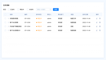 設(shè)計(jì)要點(diǎn):由于這里包含多種篩選類型,名稱和編號(hào)是關(guān)鍵詞篩選,發(fā)布狀態(tài)和、責(zé)任人、責(zé)任部門、類型是選項(xiàng)篩選,發(fā)布日期是時(shí)間區(qū)間篩選。所以我們需要采用組合篩選的模式。