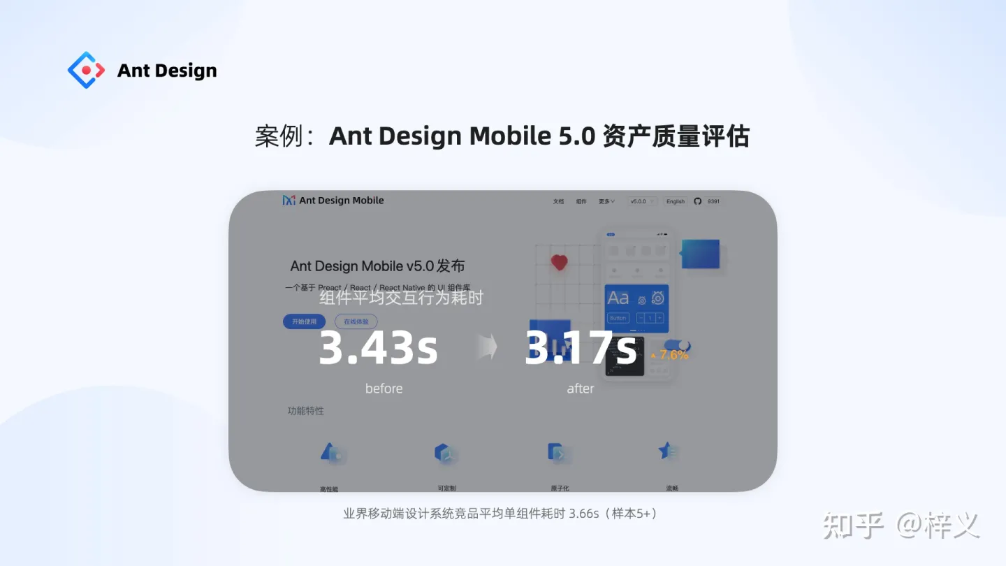 在螞蟻內(nèi)部,我們還將原規(guī)范應(yīng)用到其它設(shè)計系統(tǒng)的建設(shè)當中。比如,Ant Design Mobile 5.0 今年引來大版本的更新,從 200+ 的冗余組件收斂成了 68 個通用組件,同時通過評估發(fā)現(xiàn)其組件質(zhì)量也提升了不少,系統(tǒng)中單組件平均交互行為耗時從 3.42 降到了 3.17,高于業(yè)界平均。