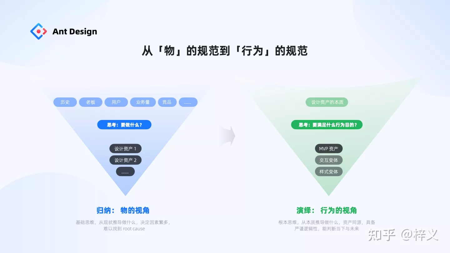這時,我們要回歸本質(zhì),去源頭尋找組件建設(shè)的決策依據(jù),一個確定的能讓團隊共識的決策依據(jù)。這個依據(jù)正是 ADM 所倡導(dǎo)的,將建設(shè)視角從歸納視角切換成演繹視角,認識到真正的設(shè)計規(guī)范不是「物的規(guī)范」而是「行為的規(guī)范」。演繹視角是一種探究本質(zhì)的思維,這與“第一性原理”一樣,我們需要去尋根究底何為組件的本質(zhì)。