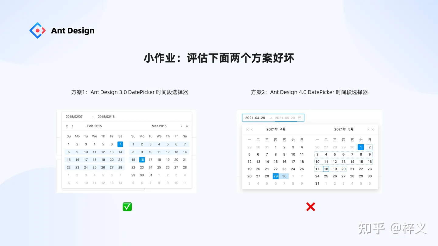 時間原因,就不再講解更多案例。這邊給大家預(yù)留一個小作業(yè),我們在 4.0 的時候升級了 3.0 日期選擇器的交互,請大家用元規(guī)范評估模型評估一下哪個方案更好?