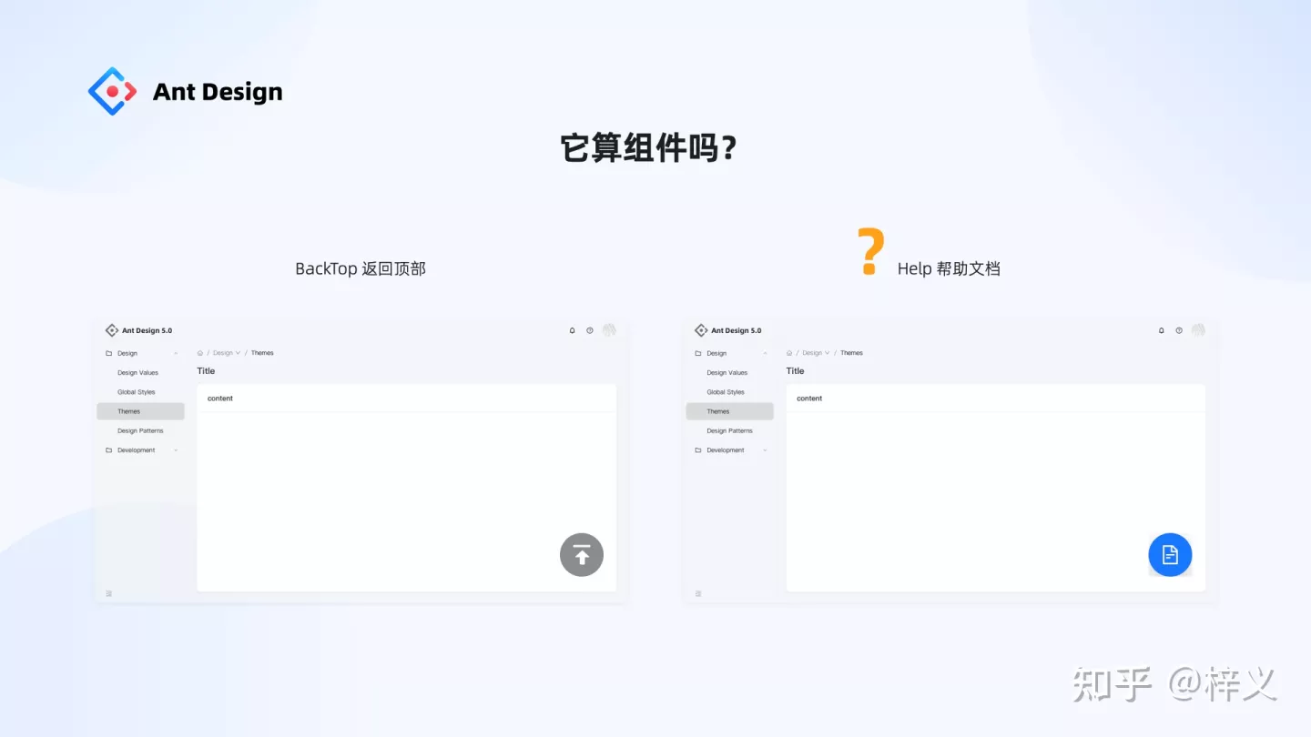 第三個問題,BackTop 組件在 Ant Design 4.0 之前作為一個獨立組件而存在,請問,它真的算是一個組件類型嗎?如果算,那右邊這種情況是否應(yīng)該歸為新的一類組件?