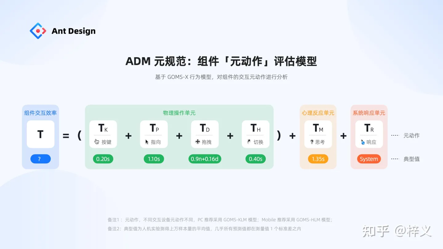 ADM 元規(guī)范的組件評估模式正式基于 GOMS 人機交互模型演變而來。GOMS 是 1983 年 Card 等人在《The Psychology of Huamn Computer Interaction》首次提出的一種交互建模方法,它的核心理念是將用戶與界面交互行為拆解為行為元動作,無需真實用戶介入就能預(yù)測交互行為的序列,評估交互的質(zhì)量。