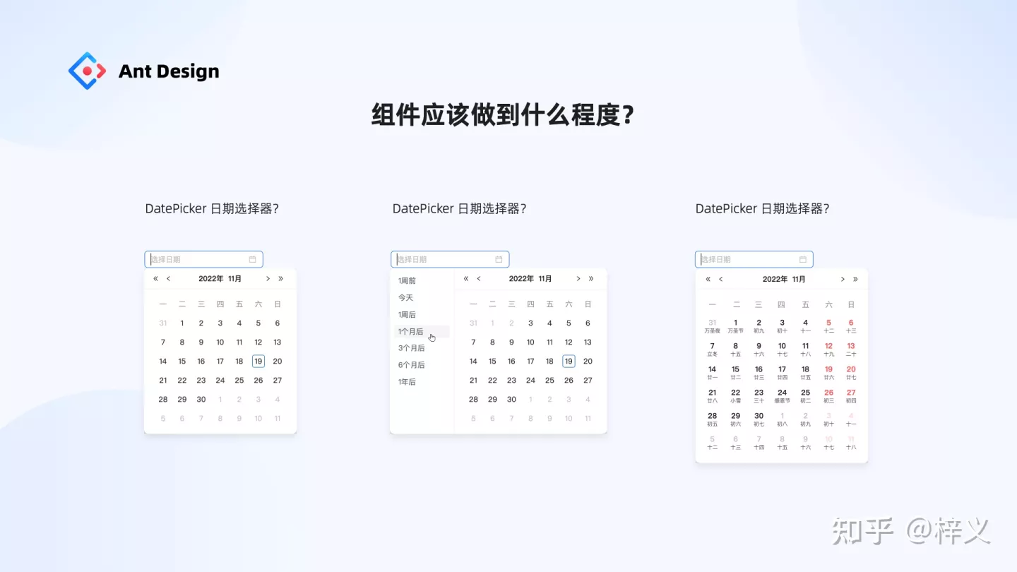 第二個問題,同樣都是日期選擇器組件,理論上它可以承載很多功能,那么,我們在設(shè)計系統(tǒng)里應(yīng)該做到何種程度才算合適呢?