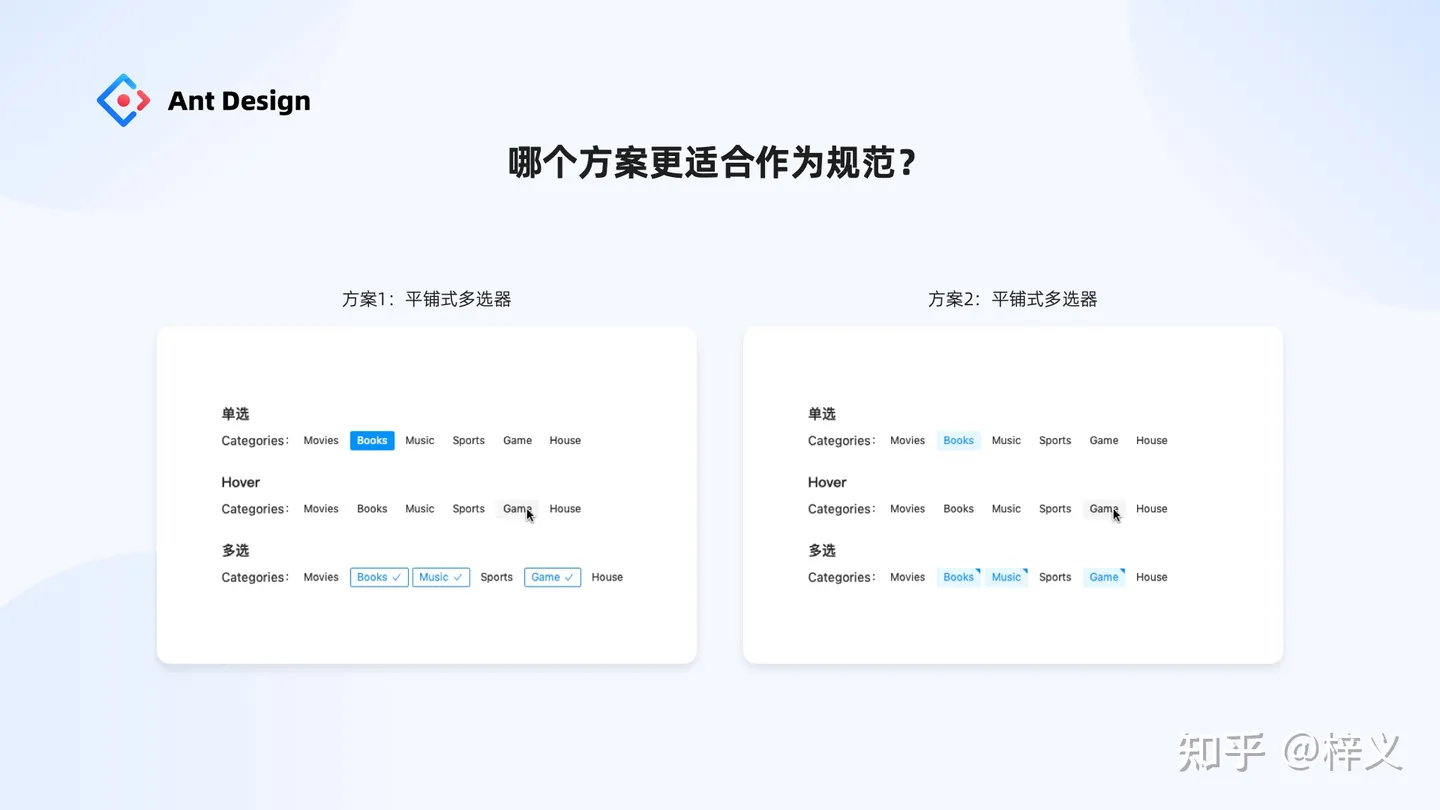最后一個問題,某設(shè)計系統(tǒng)需要建設(shè)平鋪式多選器這樣一類組件,我們有兩位設(shè)計師出了兩套方案,請問哪個方案更適合作為規(guī)范納入到設(shè)計系統(tǒng)當中呢?