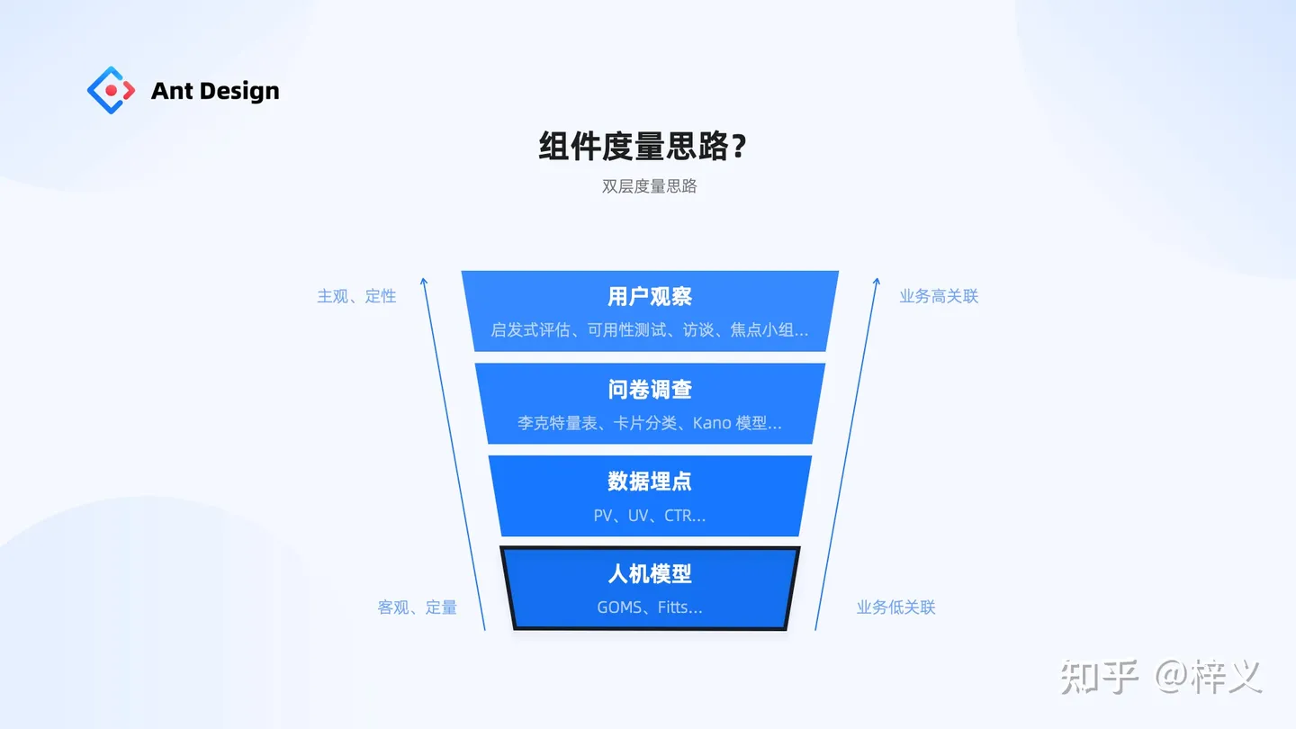 在設(shè)計研究領(lǐng)域,調(diào)研思路可抽象為以下幾類。第一 part 提到組件的本質(zhì)是「行為的規(guī)范」,因此對組件的評估,我們同樣聚焦到如何評估「組件行為」這個本質(zhì)事情上。因此我們選擇更客觀、獨立于業(yè)務(wù)的底層的人機交互模型,通過它評估而來的結(jié)果能 100% 客觀反饋交互行為的質(zhì)量。