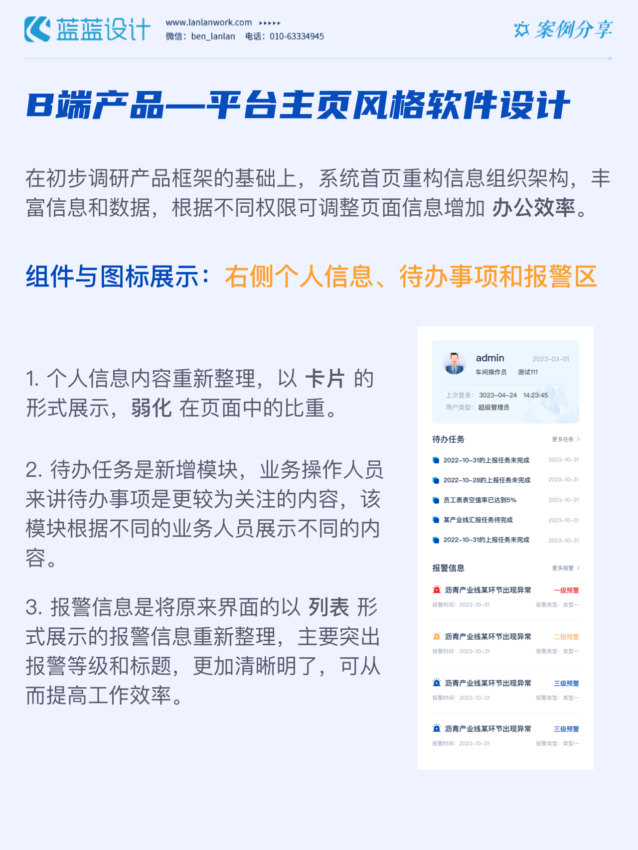 方案二:平臺(tái)主頁風(fēng)格 在初步調(diào)研產(chǎn)品框架的基礎(chǔ)上,系統(tǒng)首頁重構(gòu)信息組織架構(gòu),豐富信息和數(shù)據(jù),根據(jù)不同權(quán)限可調(diào)整頁面信息增加辦公效率。設(shè)計(jì)風(fēng)格采用簡(jiǎn)約的設(shè)計(jì)語言,模塊化布局,方圓并構(gòu)的設(shè)計(jì)模式,界面強(qiáng)調(diào)可復(fù)用性和通用性,配色采用品牌色,品牌融合度高。
