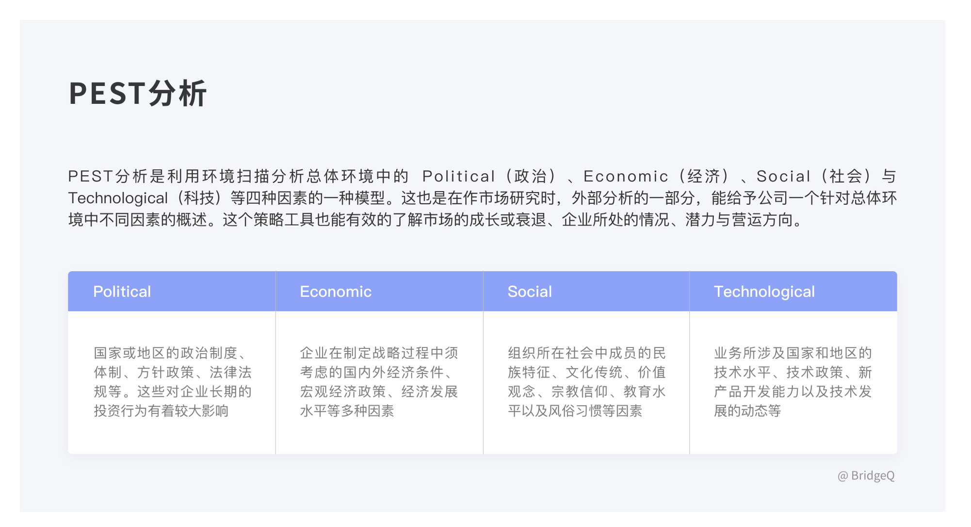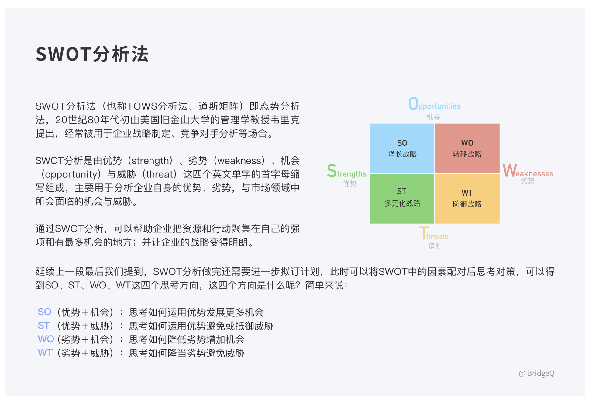 :PEST(宏觀環(huán)境)、波特五力模型(競(jìng)爭(zhēng)態(tài)勢(shì))、SWOT 分析(優(yōu)劣勢(shì))。
